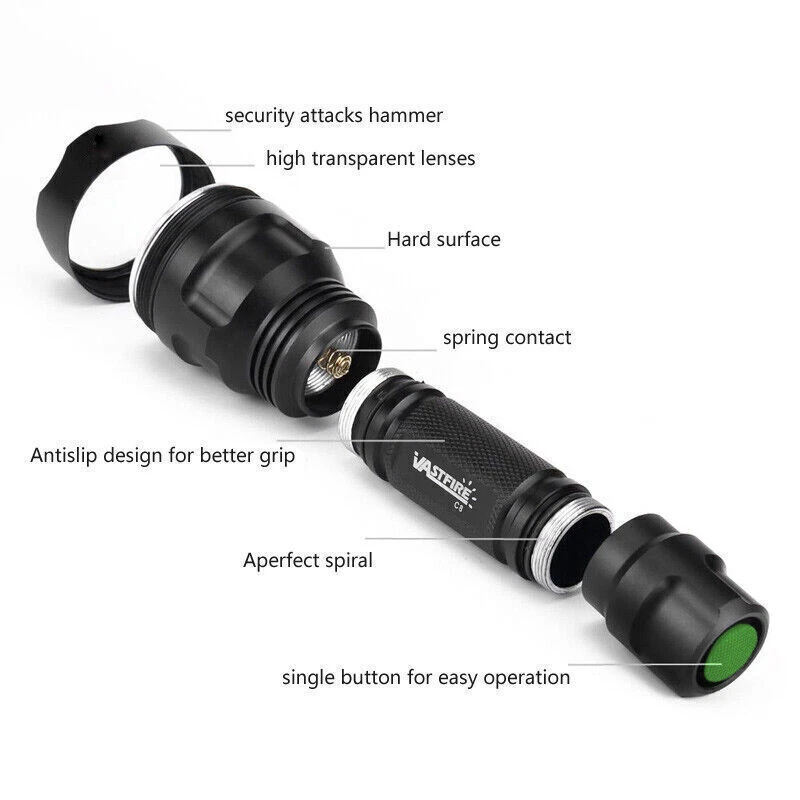 You may also like Light M952V IR Weapon LED White Dual Output Remote Switch Pressure Flashlight 57.99 USD Free shipping Rechargeable USB LED Headlamp Clip on Cap Hat Light Head Torch Fishing Camp Lamp 9.99 USD Free shipping 500000 Lumens Tactical Gun Flashlight Rifle Barrel Mount for Hunting Shooting 22.99 USD Free shipping 1000Yd Green Hunting Spotlight Predator Light Flashlight Hog Coyote Varmint Kit 17.99 USD Free shipping 4 in1 Red Blue Green White LED Hunting Light Rechargeable Flashlight 4 Modes 13.99 USD Free shipping 2X Tactical LED Flashlight Torch Zoom Hunting Red Light Astronomy Night Vision 10.99 USD Free shipping 365nm LED Flashlight Torch White Yellow UV Light for Jade Jewelry Gem Amber Test 18.99 USD Free shipping 5000000LM Flashlight LED Torch Rechargeable Tactical Work Light Zoom LCD Display 17.99 USD Free shipping 8000LM Red Flashlight Predator Coyote Hog Pig Hunting Torch Light LED New 14.99 USD Free shipping LED Flashlight UV Light 395nm Blacklight Rechargeable ZOOM Lamp Torch 8.99 USD Free shipping 800 Yards Green LED Hunting Light Predator Flashlight Coyote Hog Varmint Lamp 16.99 USD Free shipping Tactical Pistol Led Flashlight for Glock 17 19 20 21 22 23 with 20mm Rail Mount 16.99 USD Free shipping Green Hunting Light 1200 Lumen LED Rechargeable Night Vision Spotlight Torch 17.99 USD Free shipping Tactical 9000lm White Red Green LED Gun Flashlight Barrel Mount Hunting Light 34.99 USD Free shipping 1000000 Lumens Super Bright LED Tactical Flashlight Rechargeable LED Work Light 17.99 USD Free shipping Underwater Flashlight Professional Diving Light P70 LED Waterproof Dive Scuba 19.99 USD Free shipping Product Description Material: 6061T Aluminium Durable crenellated strike bezel for enhanced self-defense Bulb: GREEN LED Light Lumens: 500 lumens output(Max) Operate Voltage: 4.2V Batteries: 1xbattery (Included) Switch 1: Tail cap On/Off Switch 2: Remote Switch Daily waterproof, use it in rainy day, no problem Flashlight Diameter: 15.2cm x 4.5cm (bezel) 2.4cm (tail) Scope mount Easy fit scope mount. No tools reqd to quickly fit to Working Universally for Torches / Telescope Sights / Lasers. New Mount For Flashlight Torch Telescope Sight Laser Scope Outdoor Hunting. Material: High Quality Plastic Size(mm): full-size:110(L)X40(W)X20(D) Scope mount Anti-shaking design Working range 20-35mm Can be used on smaller scopes/torches with spacer. designed for people who want to use their torch off their or change between rifles in a hurry. Features a large easily turned knob without the need for any tools. It is approximately 75mm between centres so suits those with large objective lens on their scopes . Package included: 1X Green LED 1x ARB-L18-2400 rechargeable battery 1 x USB charger 1 X USB Line 1 x Scope mount 1 x Remote pressure switch Payment Shipping Terms Returns Contact Us About Taxes 1. We accept payment via PAYPAL ONLY . 2. Payment must be made within 4 days of auction closing. (Non-payment may result in a UPI (Unpaid Item) being put on your account. eBay will automatically close your account if you accumulate 4 UPI's total.) 3. TOTAL AMOUNT DUE includes the final auction price plus S&H(Shipping and Handling). 4.S&H will be determined based upon the SHIP TO address, Tax and customs. PLEASE NOTE: S&H DOES NOT INCLUDE DUTIES, LOCATL TAXES OR ANY OTHER IMPORTATION FEES. We are not responsible for any custom duty or import tax. 5. Please list your special requests (color, packages, etc.) in the PAYPAL NOTES SECTION when you make payment. Our working hours Beijing time from 9:00 a.m. to 18:00 p.m . Monday to Friday Delivery details 1. WORLDWIDE SHIPPING. (Except South America , APO/AFO,ect) 2.Orders processed within 24-48 hours of payment verification(excludes weekends and holidays). 3. We only ship to confirmed PAYPAL addresses. Your PAYPAL address MUST MATCH your Shipping address. 4. The images shown are not the actual item and are for your reference only. 5. SERVICE TRANSIT TIME is provided by the carrier and excludes weekends and holidays. Transit times may vary, particularly during the holiday season. 6. If you have not received your shipment within 40 days from payment, please contact us. We will track the shipment and get back to you as soon as possible with a reply. Our goal is customer satisfaction! 7. Due to stock status and time differences, we will choose to ship your item from our first available warehouse for fast delivery. 8.Delivery time: (Other countries or remote areas may take longer.) Delivery time: Country Delivery Time Working Days(not including holiday) 5-7 8-11 12-14 15-19 20-22 >22 Working Days+Saturday+Sunday 5-9 10-15 16-20 21-25 26-30 >31 United States Rate(item arrived) 5.1% 50.1% 29.6% 10.5% 4.7% Contact seller United Kingdom Rate(item arrived) 9.9% 63.2% 19.1% 3.4% 4.4% Contact seller Australia Rate(item arrived) 21.4% 50.0% 1 4.3% 7.2% 7.1% Contact seller France Rate(item arrived) 10.5% 28.6% 43.8% 10.1% 7.0% Contact seller Germany Rate(item arrived) 11.1% 22.2% 30.3% 20.9% 15.5% Contact seller Canada Rate(item arrived) 0.0% 47.1% 31.4% 17.6% 3.9% Contact seller Spain Rate(item arrived) 3.5% 25.0% 47.9% 12.9% 10.7% Contact seller (Other countries or remote areas may take longer.) Warranty: 1. One Year Manufacturer's Warranty for defective items (excluding items damaged and/or misused after receipt). Accessories come with a 3-month warranty. 2.If buyer requests a return when there is no quality problem of the item he received,return postage has to be paid by buyer,and postage for the item won't be returned. 3.If item is damaged or defective on arrival,buyer can either requests a refund or replacement,and postage will be paid by us,meanwhile,the item must be returned. Note: A. Customs duties is neither included in the item value nor the postage,which should be in the responsibility of buyers. B. Please check with your country's customs office to determine what these additional costs will be prior to bidding/buying. 1. You have 7 days to contac