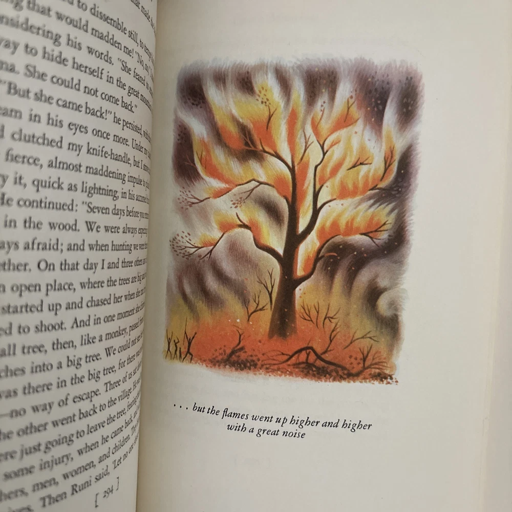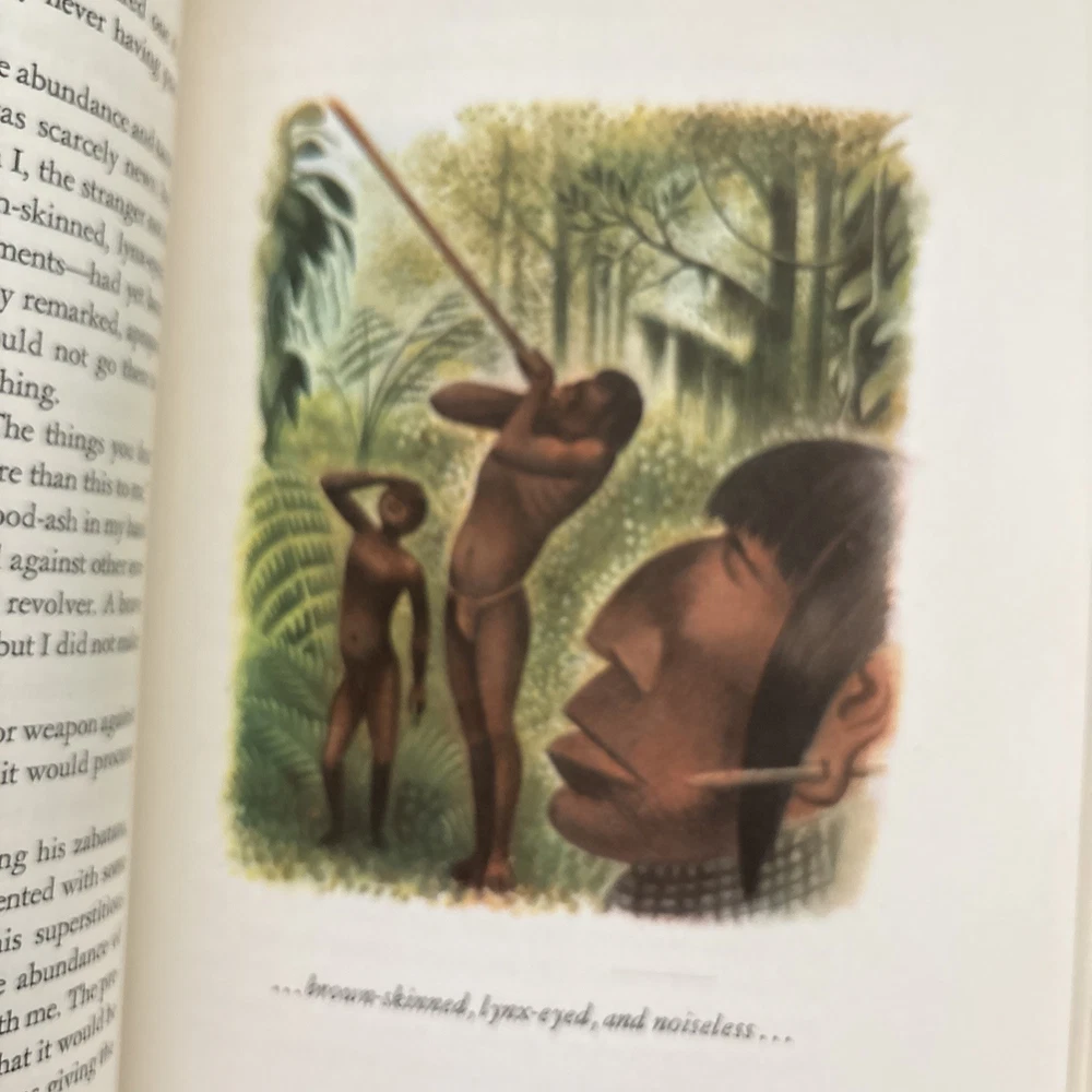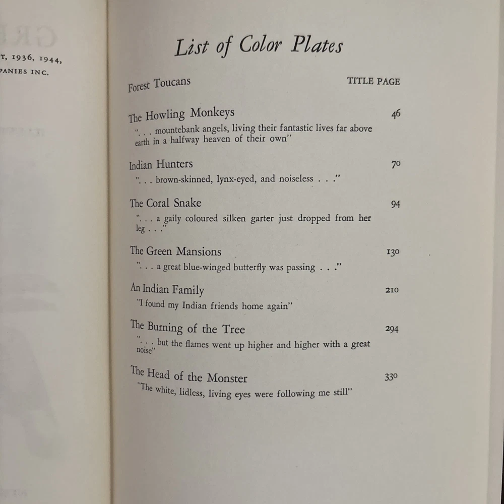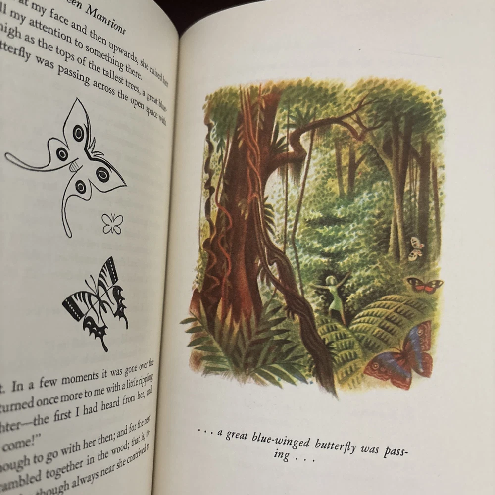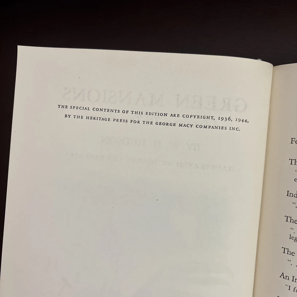 "Green Mansions" by W.H. Hudson is a romantic novel set in the tropical forest, published by Heritage Press in 1944. This hardcover edition includes illustrations by Miguel Covarrubias and is part of The Heritage Club Edition. The book, originally in English, features large print and is a collector's item with its unique setting and adventurous plot. Personalization is not available, but this special edition is a must-have for fans of literature and fiction.