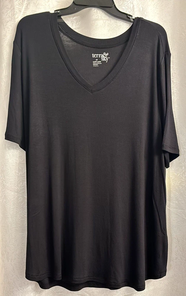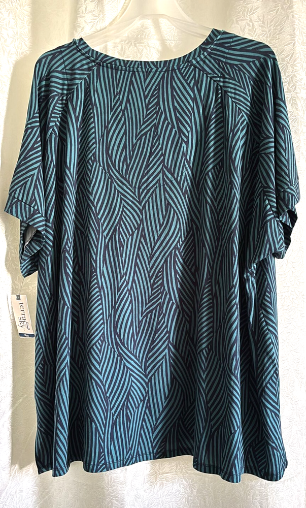 Stripe teal color , v neck tunic tee fron Terra &Sky Size 3 XL, 93% modal and 7 % spandex. Solid midnight green, v neck .Size 0XL or black Size 2XL both 97% modal and 3% spandex. Machine washable,easy care,lightweight. Teal color 3XL Black size 2XL. Midnight Green size 0X. Please specify the one you want, thank you! Price is for 1.