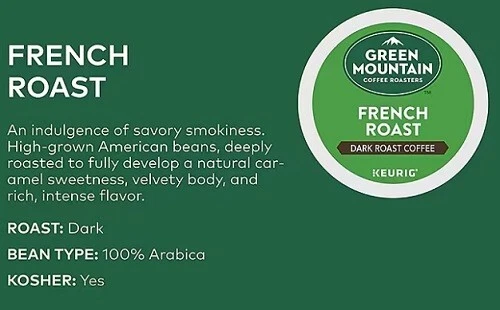 Flavor: French Roast Coffee Food Specifications: Kosher Food Aisle: Pantry Type: Espresso Serving Size: 1 Cup Expiration Date: August - December 2025 Number of Servings: 96 count Roast: Dark Product: Coffee Pod & Capsule Compatibility: Keurig Brand: Green Mountain Country/Region of Manufacture: United States