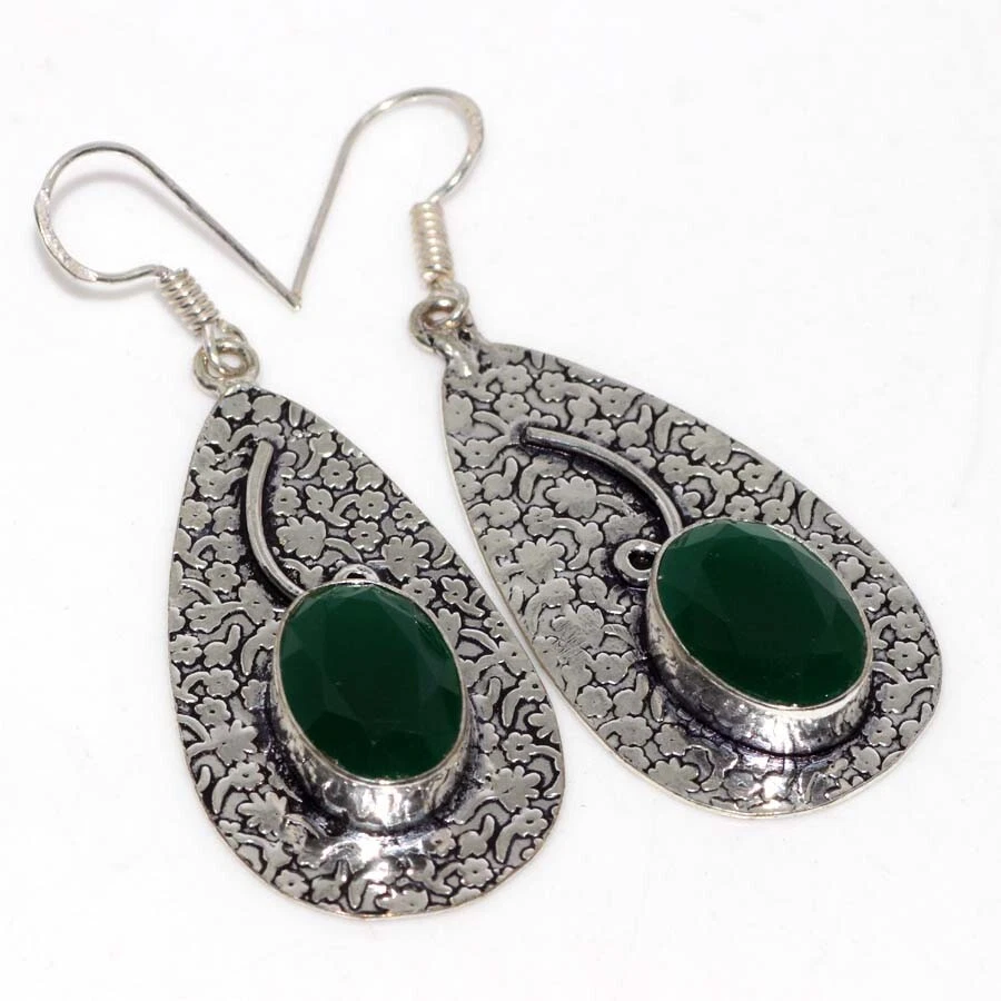 Green Onyx 925 Silver Plated Gemstone Handmade Earrings 2.3" Stylish Jewelry JW