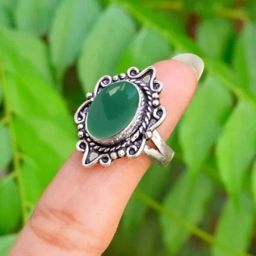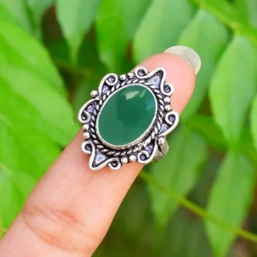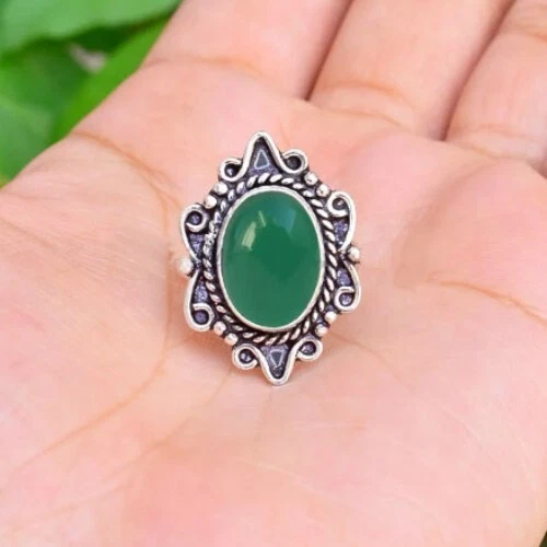 Features: Nickel-Free Base Metal: Silver Number of Gemstones: 1 Main Stone Creation: Natural Metal Purity: 925 Theme: Awareness, Beauty, Ethnic, Love Metal: Sterling Silver Customized: No Wholesale: Yes Cut Grade: Excellent Vintage: No Brand: Gemifyer Main Stone Color: Green Main Stone Width: 8 mm Main Stone: Green Onyx Occasion: Anniversary, Birthday, Christening, Christmas, Mother's Day, Valentine's Day Material: Gemstone Personalize: No Main Stone Shape: Oval Style: Band Seller Warranty: Yes Handmade: Yes Main Stone Length: 10 mm Main Stone Treatment: Clarity Enhanced Secondary Stone: No Stone Country/Region of Manufacture: India Type: Ring Country of Origin: India