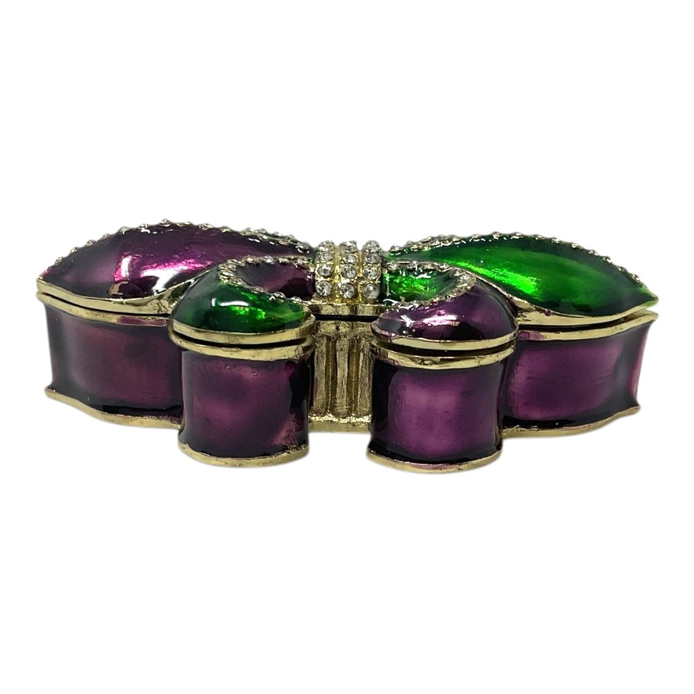 Green Purple French Fleur De Lis Jeweled Crystal Jewelry Trinket Box PRODUCT DESCRIPTION Green and Purple Fleur De Lis Trinket Box Decorated with crystals Made from a glossy enamel Approximately 1 inch tall and 3.5 inches long (3 x 9 cm) Includes original manufactures box and packaging © Copyright . All rights reserved.