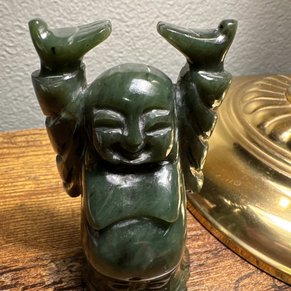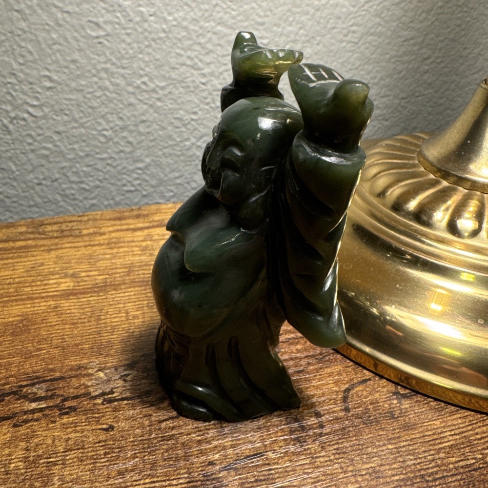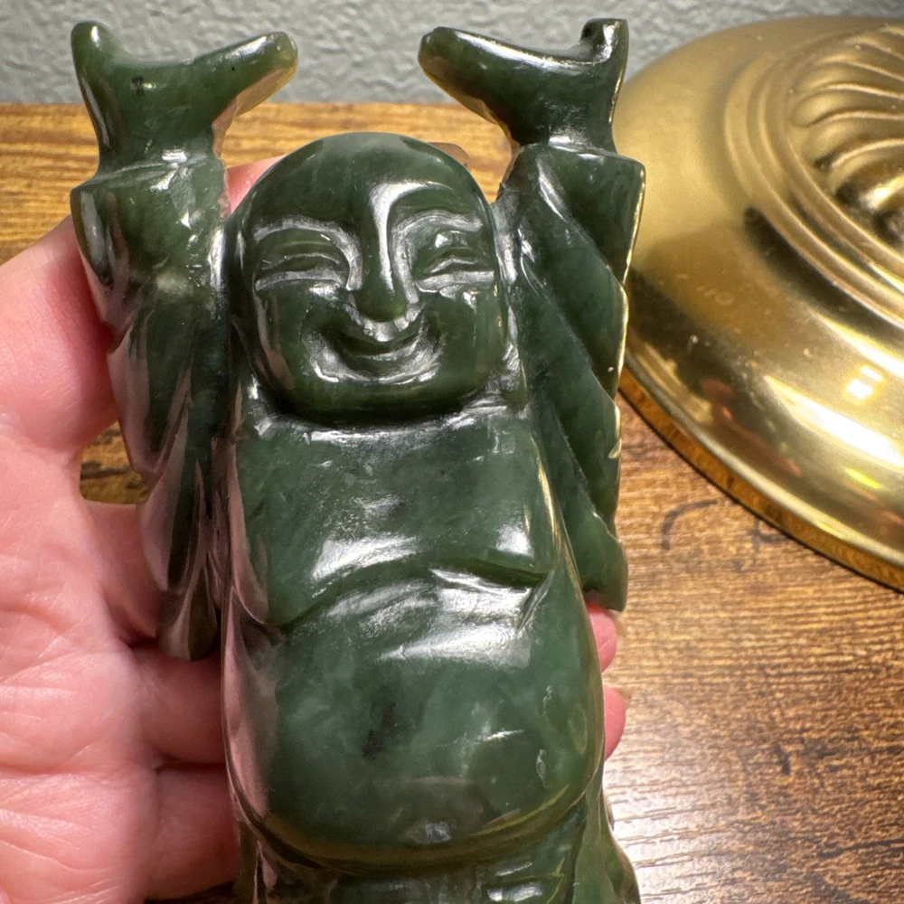Just under 4” tall, heavy little statue of laughing Buddha The Green Stone is a highly valued gemstone in Chinese culture, symbolizing purity, wisdom, compassion, courage, and modesty. The green color itself represents growth, harmony, balance, and renewal. A green Laughing Buddha is believed to foster family harmony and personal growth.
