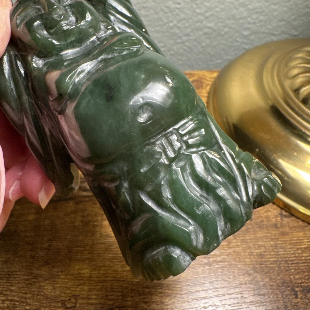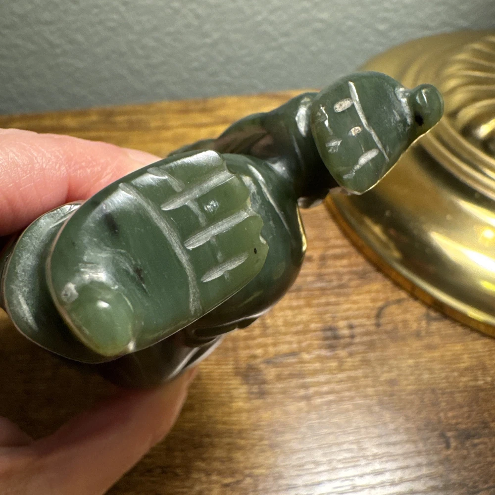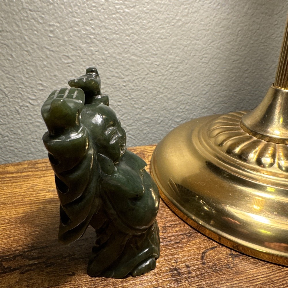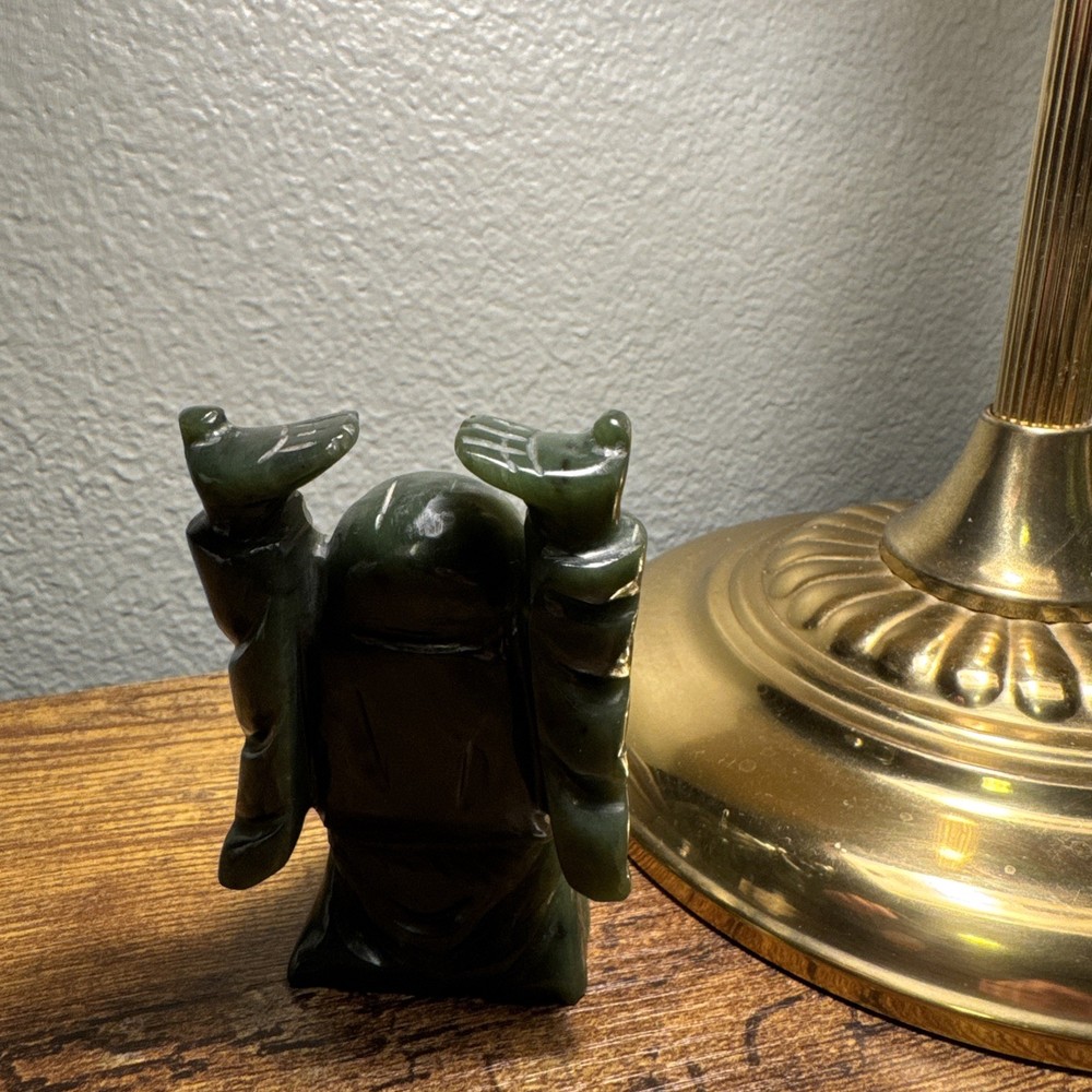 Just under 4” tall, heavy little statue of laughing Buddha The Green Stone is a highly valued gemstone in Chinese culture, symbolizing purity, wisdom, compassion, courage, and modesty. The green color itself represents growth, harmony, balance, and renewal. A green Laughing Buddha is believed to foster family harmony and personal growth.