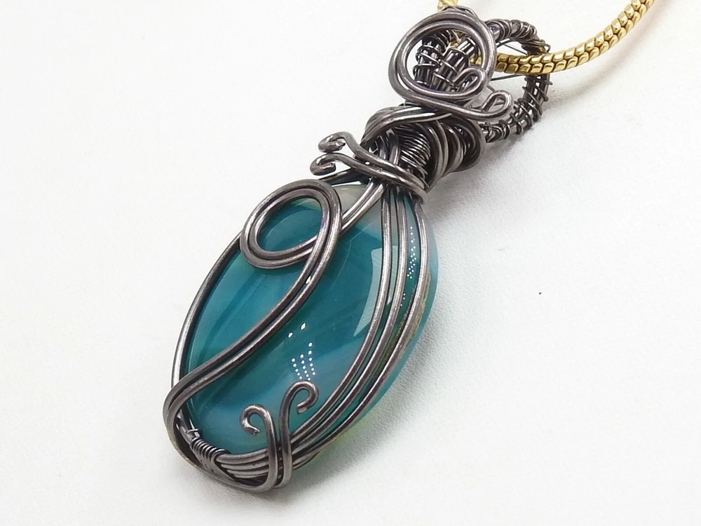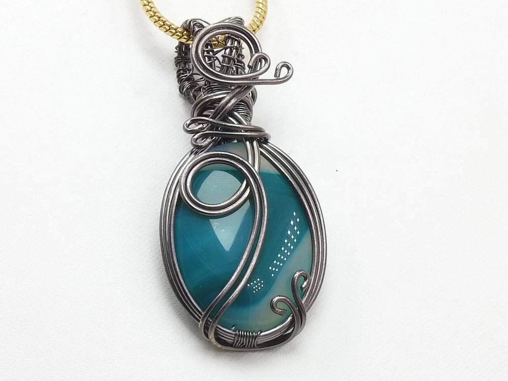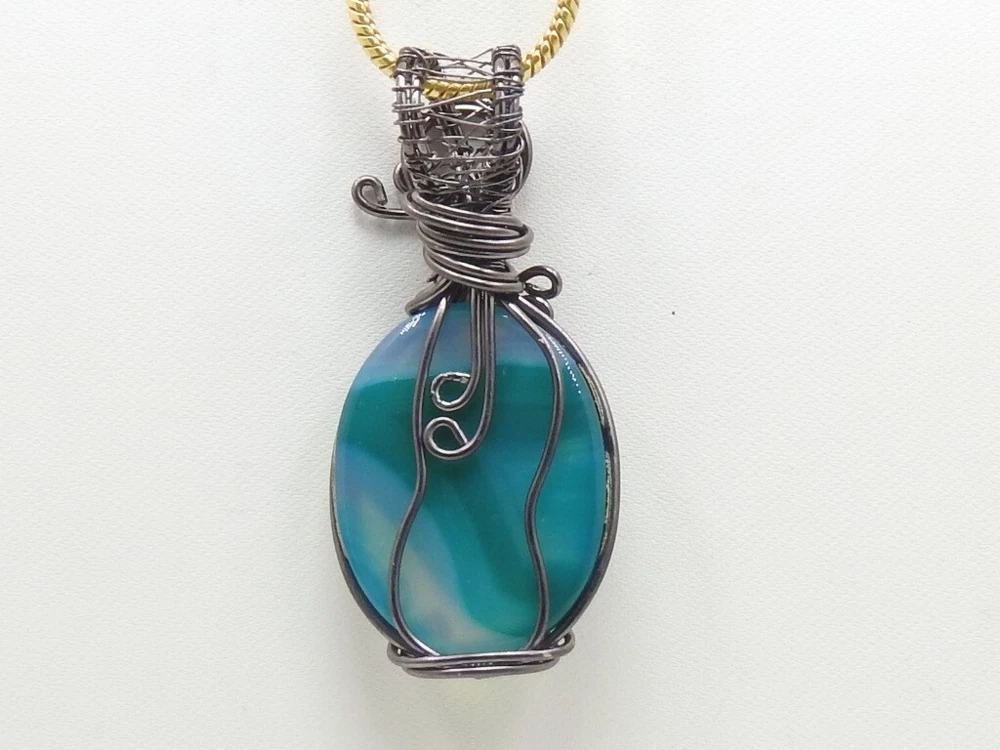 Green Strip Agate Brass Pendant Silver Oxidised Polished Wire Wrapped Jewelry