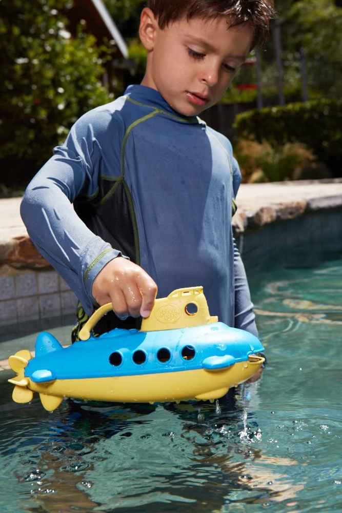 Safe Watercraft: this pool toy is made using 100% earth friendly material like plastic milk jugs. It contains no BPA, Phthalate and is PVC safe. It meets FDA standards to offer safety even when your toddler happens to lick it Easy to clean: the toddler toy can be conveniently cleaned. Cabin of this submarine toy can be opened for easy cleaning and is dishwasher safe. This toy can be easily cleaned using baby soap or a shampoo Pool Playing Toy Use: this water toy will help your kids or toddlers explore the terrain at the bottom of their tub. It will also help them enjoy their nautical journey. Wide mouth opening will allow the kids to enjoy scooping and pouring Toy Submarine Features: pool toy highlights a spinning rear propeller with flat bottom to offer stability. It features a classic handle that will help your kid to maintain a strong grip that may also help in improving their pincer grip Earth Friendly Packing: even the packing has been done using earth friendly materials. It is packed using recycled materials and printed using soy inks — a crucial step towards safety of environment Made in the USA from 100% recycled milk jugs US supply chain reduces greenhouse gas and saves energy Phthalate and BPA free Floats great in the bathtub and pool Dishwasher safe for easy cleaning Product Description Now toddlers can enjoy their pool party in an innovative way by opting for Green Toys Submarine. This yellow color watercraft is made with 100% recycled plastic milk jugs which are safe for earth as well as your child. This pool toy is a BPA and Phthalate Free and conforms to FDA standards to ensure your toddlers stay safe even if they try licking it. This toy submarine features a spinning rear propeller along with a flat bottom that helps in offering stability to the toy. This indoor and outdoor toy is provided with a classic handle that would maintain a child’s strong grip while enjoying scooping and pouring. Dimensions-10.25 L x 5.25 W x 4.5 H inches From the Manufacturer Take the helm of the Green Toys Submarine for a nautical journey to help protect the planet. Submerge it underwater to explore the terrain at the bottom of the tub and let it resurface to scan the horizon in search of the next adventure. Made in the USA from 100% recycled plastic milk jugs that save energy and reduce greenhouse gas emissions, this sturdy watercraft features a spinning rear propeller, a flat bottom for added stability, and the classic handle and wide-mouth opening combination for plenty of scoop and pour fun. The cabin can be opened for easy cleaning, while the whole vessel is also dishwasher safe. No BPA, phthalates, PVC or external coatings and also meets FDA contact standards. Packaged with recycled and recyclable materials and printed with soy inks. Recommended for ages 6 months and above. Dimensions-10.25 L x 5.25 W x 4.5 H inches