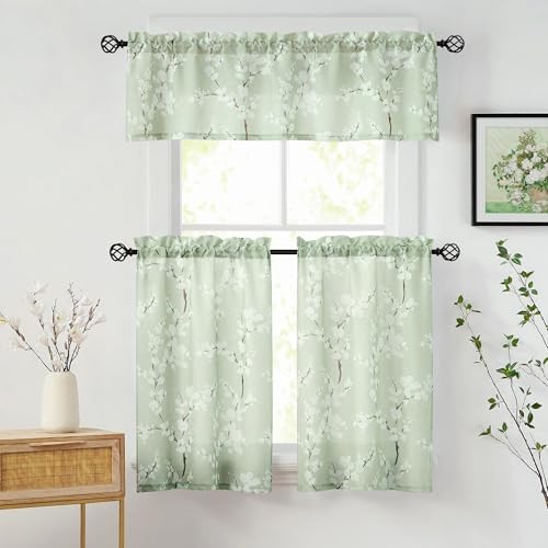 Green White Kitchen Tier Curtains 24 Inch Length Blossom Print Half Window