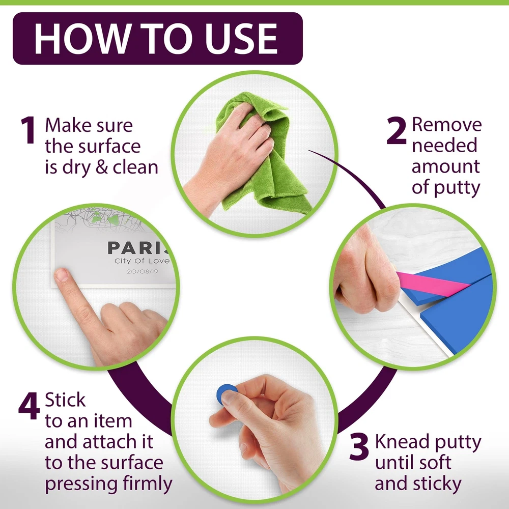 Keep collectibles, figurines and fragile items in place, attach home decor, enjoy crafting - all this is possible with GreenFix adhesive putty! What are the advantages of our sticky putty? PREMIUM QUALITY: GreenFix blue sticky tack is made using the best non-toxic materials on the market meeting the highest standards of quality and completely safe to use. TRACELESS REMOVAL: forget about sticky residues. Our mounting putty can be removed easily without leaving any oil marks or damage, leaving the surfaces intact. REUSABLE: tacky putty is endlessly reusable, providing you with an eco-friendly alternative to traditional tapes and adhesives. Simply remove, reshape, and reuse as needed. Rest assured wall putty is as sticky as it was before! SECURE VALUABLES: use putty to display figurines, collectibles, secure fragile items and prevent them from falling. Great as mounting squares, picture hangers, hanging strips, poster putty, earthquake putty, sticky dots or double sided tape. In our set of Blue Tacky Adhesive Putty except the ticky tack, you receive a cutting tool as a FREE BONUS to help you remove the right amount of putty for your purpose! How to use blue tack putty? - remove needed amount of putty; - knead sticky tack in your palm to make it soft; - paste a piece of adhesive to your item; - attach the item to surface pressing it firmly. In just these few simple steps you are finished! Getting GreenFix Blue Removable Mounting Putty set we guarantee the ⭐ ️ BEST QUALITY and 💯% RESULT! Save yourself some time and trouble! ✅ PREMIUM QUALITY: GreenFix sticky tack set is made from high quality non-toxic materials and includes 2.65oz (75g) blue tack putty. ✅ REMOVABLE & REUSABLE: mounting putty can be easily removed leaving no marks or residue! After removal, you can give poster tack a second chance to live and reuse it. ❇️ SECURE VALUABLES: use museum sticky tack putty to attach collectibles & figurines, secure decorations & fragile items in a neat, safe and non-intrusive way. Wall putty is a perfect alternative to picture hangers, poster tape, sticky dots, earthquake putty. hanging strips, hooks or nails! ❇️ SUITABLE SURFACES: blue tacky adhesive putty is applicable to most smooth surfaces such as metal, plastic, glass, wood, tile, etc. For the best result make sure the surface is clean and do not paste on wet, greasy, patchy surfaces, freshly painted walls or wallpaper. 🎁 FREE BONUS included in the removable poster tacky putty set for convenient use! Find the cutting tool in the box to help you remove the right amount of putty for your purpose avoiding mess.