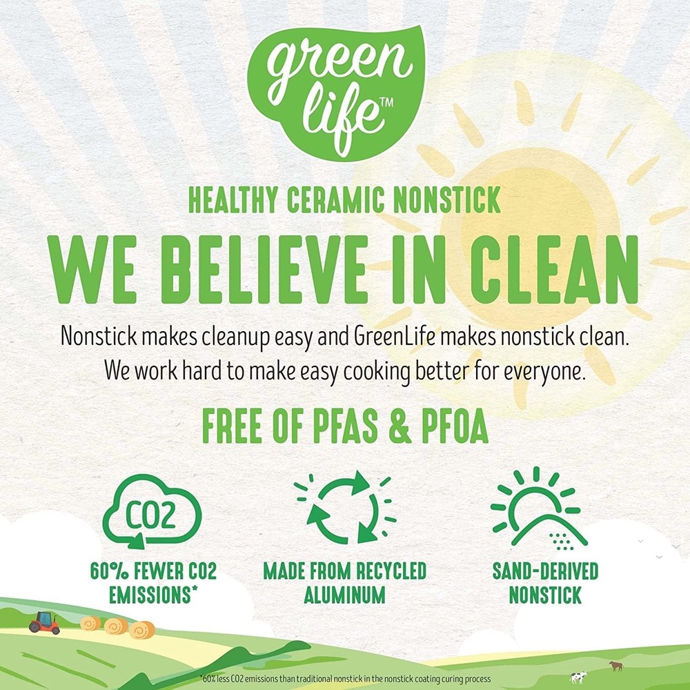 GreenLife Soft Grip Healthy Ceramic Frying Pan/Skillet, 8", Turquoise Product Details Brand: GreenLife Material: Ceramic, PFAS Free Nonstick, Bakelite Handles Special Feature: Dishwasher Safe Color: Turquoise Capacity: 4 Quarts Compatible Devices: stove Product Care Instructions: Dishwasher Safe Maximum Temperature: 350 Degrees Fahrenheit Handle Material: Ceramic Is Oven Safe: Yes Model Name: Soft Grip Has Nonstick Coating: Yes Is Dishwasher Safe: Yes Recommended Uses For Product: versatile stovetop and oven cooking, including sautéing, searing, and frying a variety of dishes Specific Uses For Product: versatile stovetop and oven cooking, including sautéing, searing, frying, and making pancakes and scrambled eggs; not intended for induction stovetop Shape: Round Product Dimensions: 14.37 x 8.27 x 2.56 inches Item Weight: 15.5 ounces Manufacturer: GreenLife Language: English, German, Spanish, French, Dutch Country of Origin: China Item model number: CW000521-002 Is Discontinued By Manufacturer: No HEALTHY CERAMIC NONSTICK: Our healthy and easy-to-clean ceramic nonstick coating is derived from sand and delivers effortless release with quick cleanup TOXIN-FREE: Our coating is free of PFAS, PFOA, lead, and cadmium so you can make every meal healthier STAY-COOL HANDLES: Soft Grip Bakelite handles are designed to stay cool on the stovetop for maximum comfort WOBBLE-FREE BASES: Each frypan is reinforced with a wobble-free base for extra strength and even heating EASY TO CLEAN: Dishwasher safe, but most messes wipe away SNAG-FREE INTERIORS: The rivetless interiors prevent food buildup and make cleaning simple EFFORTLESS PERFORMANCE: Delivers on all stovetops, except induction and oven safe up to 350˚F MADE WITH RECYCLED MATERIALS: Cookware vessels (excluding handles) are made from a minimum of 65% recycled materials This Soft Grip frying pan is all about comfort and control. Designed for effortless performance and cleanup, this pan features our toxin-free Thermolon nonstick coating, which is free of PFAS, PFOA, lead, and cadmium. GreenLife’s healthy ceramic nonstick is not stuck in the past—that’s why our ceramic nonstick starts with sand and creates 60% less CO2 emissions during the curing phase than traditional coatings. This pan is also crafted with recycled aluminum, because we want your kids’s kids to cook healthy, too. Finished in vibrant colors, this pan is outfitted with a stay-cool handle to keep your cooking comfortable. For all stovetops, except induction. Oven safe to 350°F. Dishwasher safe.
