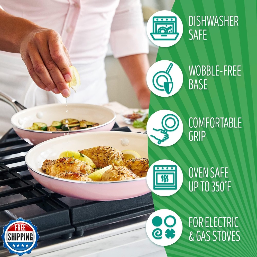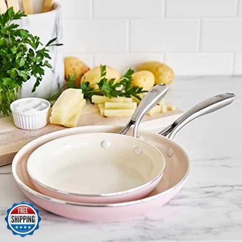 GreenLife Artisan Healthy Ceramic Nonstick, 8" and 10" Frying Pan Skillet Set, Stainless Steel Handle, PFAS-Free, Dishwasher Safe, Oven Safe, Soft Pink Features SET INCLUDES: 8" frying pan and 10" frying pan TOXIN-FREE: Our healthy ceramic nonstick coating is derived from sand and free of PFAS, PFOA, lead, and cadmium for worry-free cooking. CERAMIC NONSTICK: The incredible ceramic nonstick coating delivers easy releases, seamless transfers, and effortless cleaning. OVEN SAFE: Artisan is designed for advanced cooking, so these pots and pans are oven safe up to 600˚F MADE WITH RECYCLED MATERIALS: Cookware vessels (excluding handles) are made from a minimum of 65% recycled materials. DISHWASHER SAFE: Wipe messes away or place in the dishwasher for an even easier cleanup. EASY TO CLEAN: Dishwasher safe, but most messes wipe away EFFORTLESS PERFORMANCE: Delivers on all stovetops, except induction and oven safe up to 350˚F WOBBLE-FREE BASES: Each frypan is reinforced with a wobble-free base for extra strength and even heating Shipping Free & Fast Shipping: We offer free shipping to most of the USA with a normal delivery time of 3-7 days. However, due to the current situation, additional delivery time (up to 3 weeks) may be required for some items. Alternative Carriers: We may use alternative carriers (e.g., USPS, FedEx, UPS) to ensure your package arrives safely and on time. Due to the use of multiple carriers, we are unable to provide a tracking number automatically. Handling Time: Orders are processed and shipped within 1-2 business days of receiving cleared payment. Shipping Restrictions: Shipping to Alaska, Hawaii, Puerto Rico, Guam, and other US territories may incur shipping charges or delivery restrictions. Please contact us before ordering, or your order can be refunded/cancelled. State Restrictions: Certain items may not be shipped to California due to state regulations. Contact for Tracking Updates: If you require tracking updates or have any concerns about the delivery of your order, please feel free to contact us, and we will be happy to assist you. Return Policy 30-Day Hassle-Free Returns: If you are not completely satisfied with your purchase, you can return the item for free within 30 days of receiving it for a full refund or exchange. Easy Return Process: Contact us, and we will provide you with a prepaid return shipping label and detailed instructions. No Restocking Fee: There are no restocking fees for returns. However, the buyer is responsible for return shipping costs if the return is not due to a seller"s error. Refund Processing: Refunds will be processed within 1 business day of receiving the returned item in its original condition. Feedback Your feedback is extremely important to us. We strive to provide the best products and customer service possible. If you are satisfied with your purchase, please take a moment to leave us a positive review. If you have any concerns or issues with your order, please contact us before leaving negative feedback. We are committed to resolving any problems and ensuring your satisfaction. Contact Us If you have any questions or concerns, please feel free to reach out to our customer support team. You can contact us through the eBay messaging system. We are available Monday to Friday, 9:00 am to 5:00 pm EST, and we will do our best to respond to your inquiry within 24 hours. Thank you for supporting our small family business!