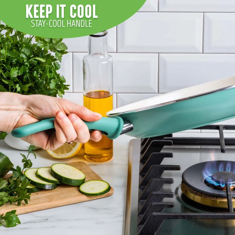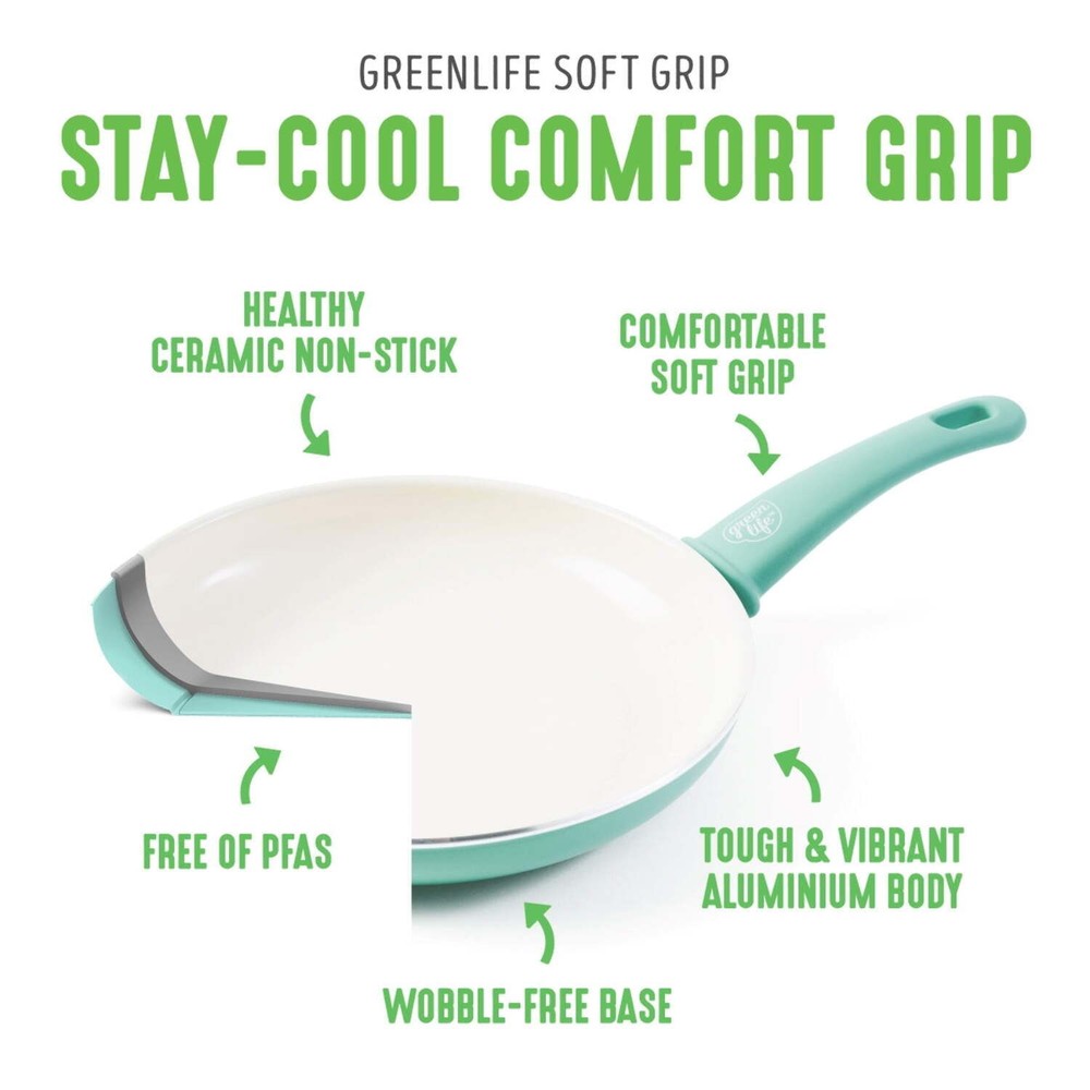 You’ll flip for this frypan—whether making pancakes and scrambled eggs or sautéing veggies and searing meat. Plus, the bright colors make kitchen time more fun. Our Soft Grip collection helps you get a grip—literally! Stay-cool bakelite handles offer extra comfort that makes everyday cooking easier than ever. Best of all, our healthy ceramic nonstick coating releases even the stickiest foods (hello, cheese) effortlessly and wipes clean in seconds, no soaking required. Our healthy and easy-to-clean ceramic nonstick coating is derived from sand and free of PFAS, PFOA, lead, and cadmium for effortless cooking and quick cleanup Soft Grip's Bakelite handle is designed to stay cool on the stovetop for maximum comfort Made from recycled aluminum and reinforced with a wobble-free base for extra strength and even heating Dishwasher safe, but most messes wipe away Rivet less interior to prevent snags and food buildup Oven safe to 350°F For all stovetops except induction