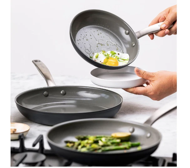 Triple your meal possibilities with this versatile set of three frying pans, each with a nonstick surface and a dishwasher-safe design for quick and easy cleanup. From GreenPan. Includes 8", 9.5", and 12" fry pans Ceramic nonstick coating Aluminum construction Dishwasher- and oven-safe to 425F Imported