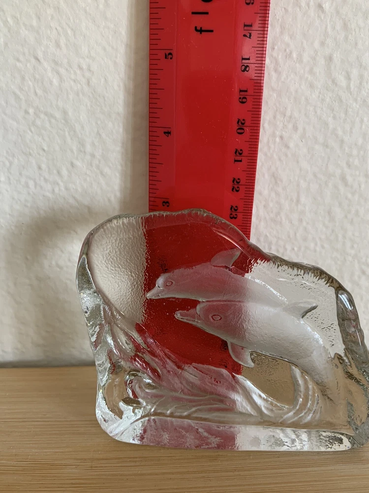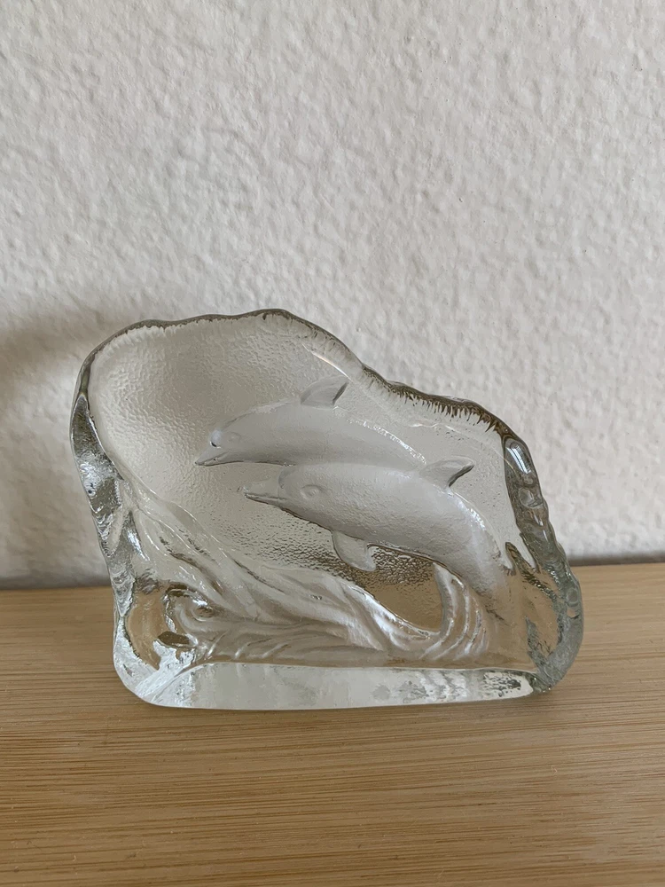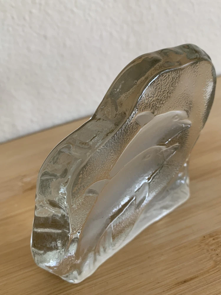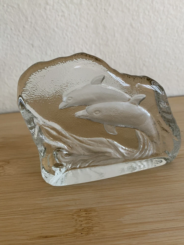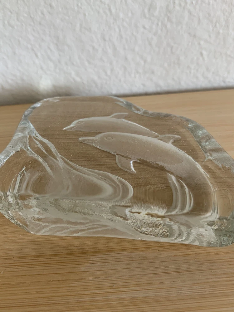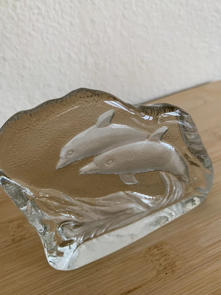 Greenbrier International Art Glass Clear Swimming Dolphins Pressed Etched Paperweight....