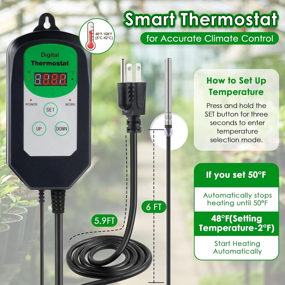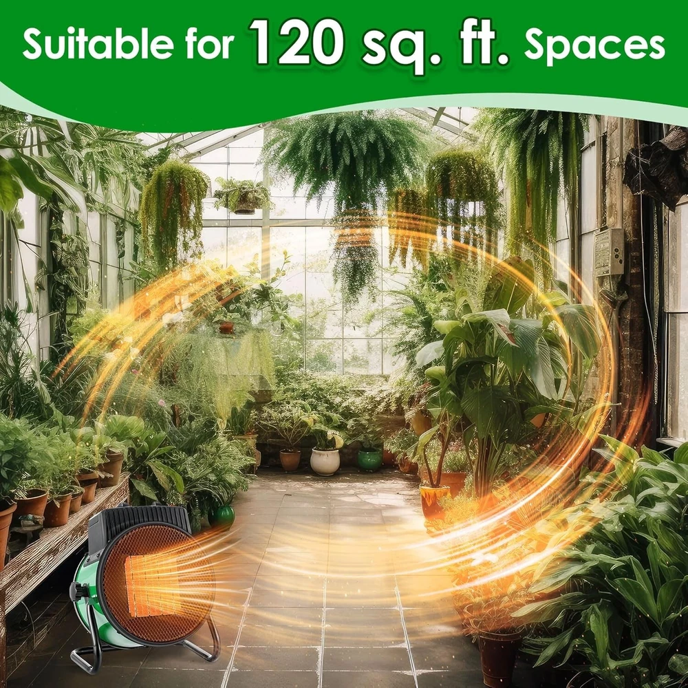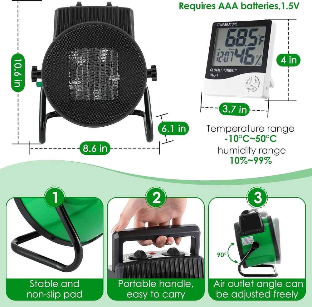Greenhouse Heating Kit: package include 1 x 110V greenhouse heater fan(1500W heating, 800W heating, 25W cooling); 1 x 1800W digital heat thermostat, temperature range of 40°F-108°F (5°C-42°C); 1 x additional thermohygrometer (temperature range: 10°C-50°C, humidity range: 10-99 percent); 1 x user manual 3 Output Modes for Accurate Climate Control: this greenhouse heater has 3 output modes: 25W Fan / 800W Heat / 1500W Heat, adjustable temperature range is 40°F-108°F (5°C-42°C), suitable for 120 sq. ft. Spaces; You can adjust the temperature according to plant growing conditions or other different needs Smart Thermostat Overheat Protection: the waterproof temperature probe can sense changes in surrounding room temperature, and the temperature controller accurately controls the temperature range you set; Greenhouse heater will stop when the set temperature is reached and start heating when it is 2 degrees fahrenheit below the set temperature Quality and Safety: the greenhouse heater is made of quality flame retardant materials, utilizes PTC ceramic heating, IPX4 waterproof rating; Rapid cooling: safeguard against accidental burns or shutdown, enhanced durability and safety User Friendly Design, Convenient Operation: the electric greenhouse heater is equipped with a high power copper motor for efficiency and low energy consumption, smooth and quiet performance; Additional temperature and humidity monitors enable real time indoor climate monitoring; The handle and base are non slip and easy to move, and the air outlet angle can be adjusted freely Note: 1. If applied in an environment with a lot of dust or feathers, it needs to be cleaned regularly. 2. When the product is applied continuously for 48 hours, it can be powered off for about 30 minutes to give the internal heating wire a rest, which can extend the service life