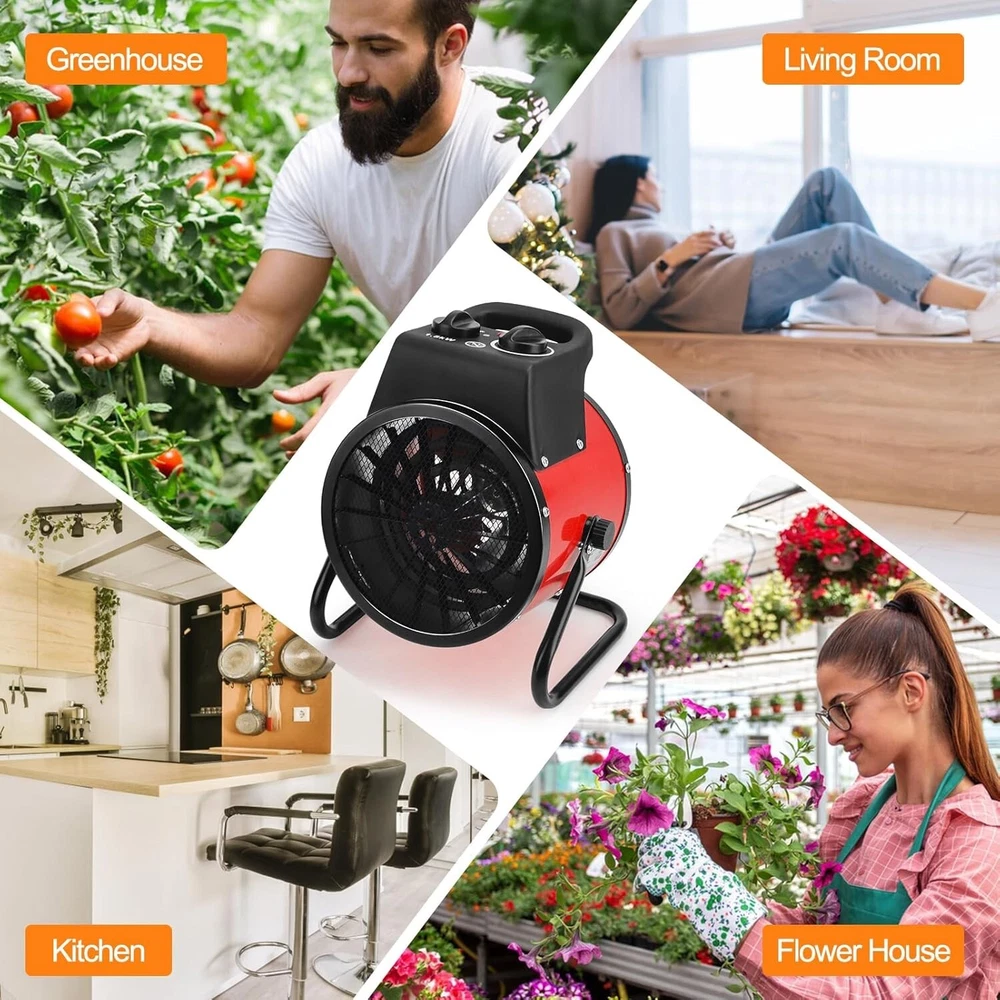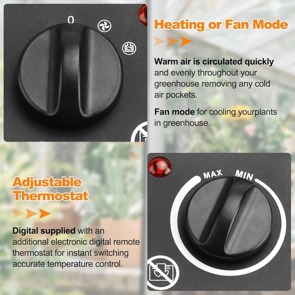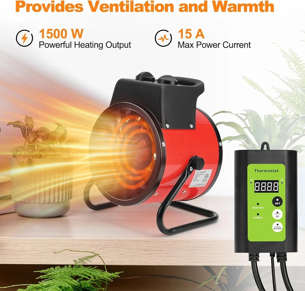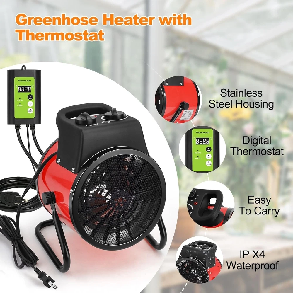 Greenhouse Heater with Thermostat - 1500W Grow Tent Heater, Greenhouse Fan, Portable Outdoor Heater for Green House, Grow Tent, Flower Room, Overheat Protection/4 About this item 【Efficiency Greenhouse Heater】: Greenhouse heater with thermostat 1500W power, can effectively heat the space, to achieve fast, efficient heating, quickly increase the temperature in the greenhouse, its high-performance heating elements can ensure stable heat distribution, effectively create the ideal growing environment. 【Digital Thermostat】: The POOPLE greenhouse heater is equipped with a digital thermostat that controls the ambient temperature by sensing the air temperature with a waterproof temperature probe. Set the desired temperature at the click of a button. The adjustable heating range is 40.0℉-108.0℉ (5℃-42℃). 【Heating And Fan Modes】: The electric greenhouse heater has two output modes to choose from: 25 watt fan mode and 1500 watt heating mode. This electric heater allows you to adjust the temperature according to plant growth or other different needs. Take care of your plant growth all year round. 【High Quality Design】: The greenhouse heater is made of high quality metal for superior durability and weather resistance. Our electric heaters include a self-resetting thermal circuit breaker that automatically cuts off power when the internal temperature reaches the thermal protection temperature. Once the ambient temperature falls below the set temperature, the heating element will continue to operate. Very safe and reliable. 【Maximum Portability】: The Small Greenhouse Heater has a compact size of 7.5x8.7x10.9 inches and fits perfectly into any space. Thoughtful design includes a convenient carrying handle for easy transport and placement wherever needed. Enjoy efficient warmth and portability all season long.