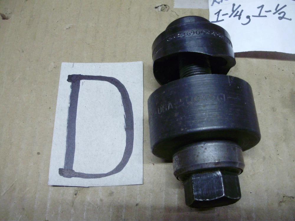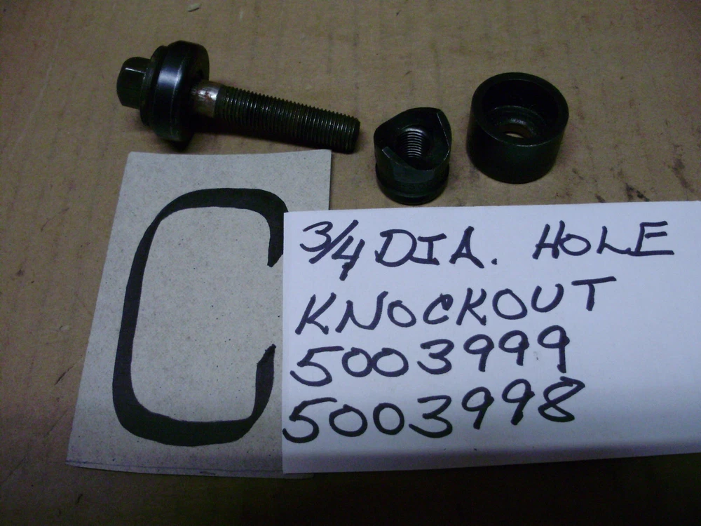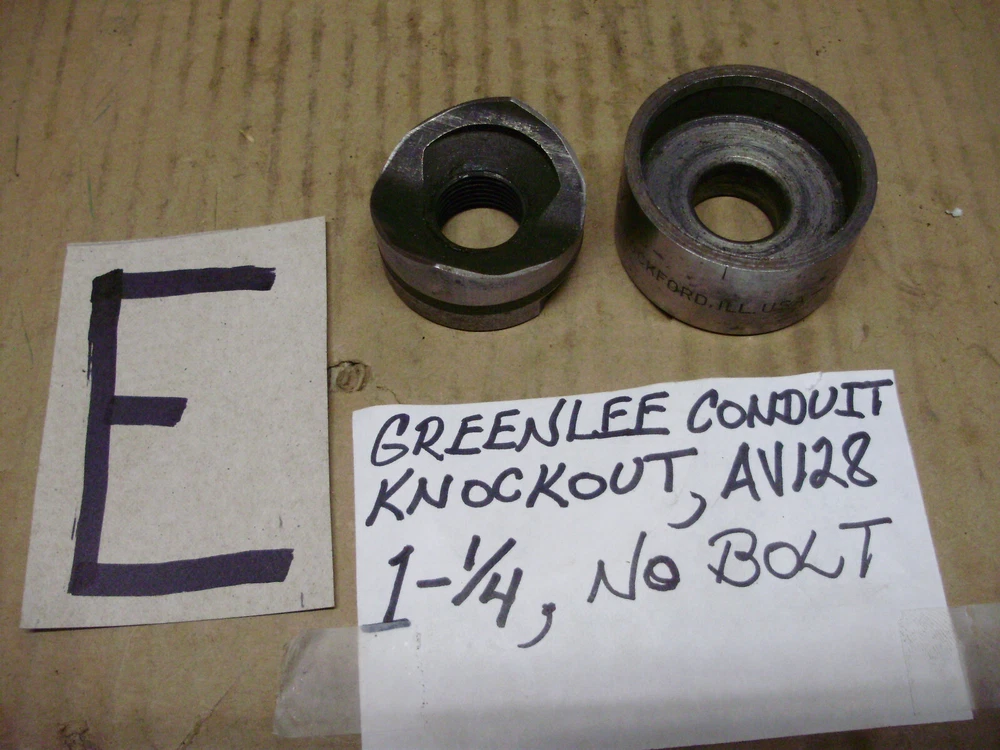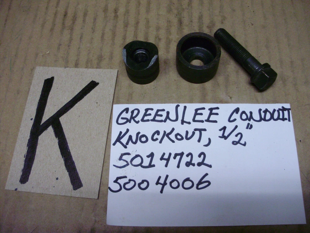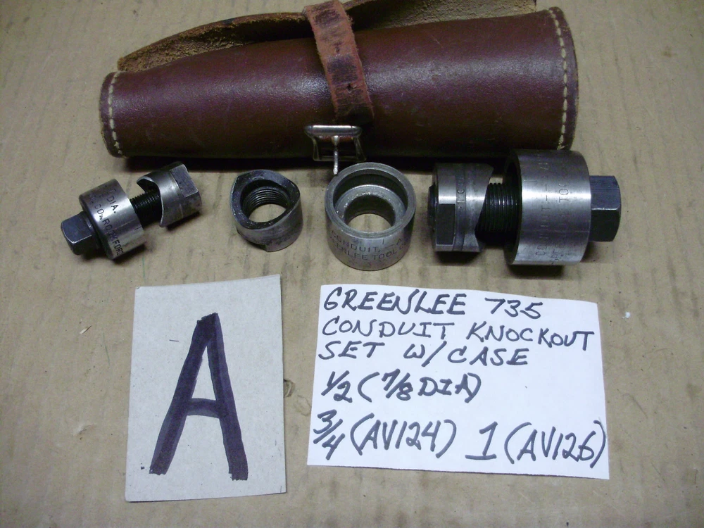 For sale are used Greenlee knockouts. All seem to be in good condition except one which has a chip. You can see it in the picture. --A) 735 Conduit Knockout Set, 1/2, 3/4, 1", --B) 1/8 Key 7/8 Dia Hole Knockout 730-K50234, --C) 3/4 Dia Hole Knockout 5003999, --D) 1-1/4, 1-1/2", Knockout Set, --E) 1-1/4" Knockout, AV127, AV128, No Bolt, --G) 1-11/64, 732 Key Radio Chasis Knockout, **CHIPPED**, --K) 1/2 Conduit Knockout, 5014722, 5004006 If you have any questions just ask.