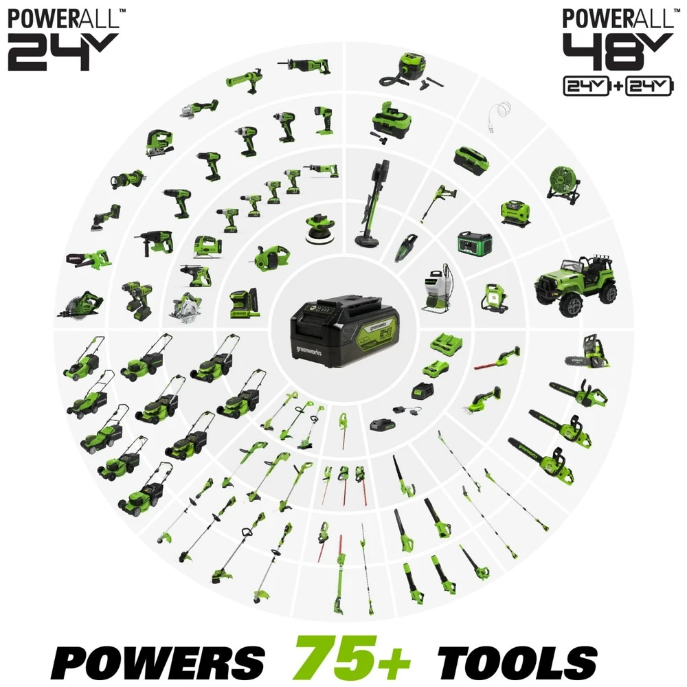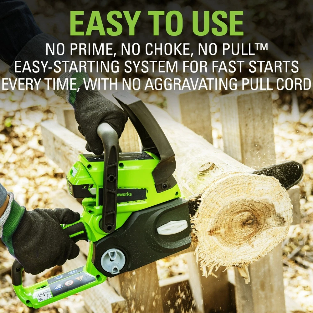 Greenworks 24V 10" Cordless Chainsaw: 24V lithium-Ion battery compatible with both indoor and outdoor tools 10" bar and chain suitable for cutting branches and limbs Tool less chain tensioning for quick adjustments so you can get back to the task at hand 2AH battery included