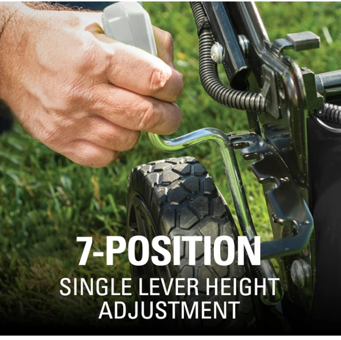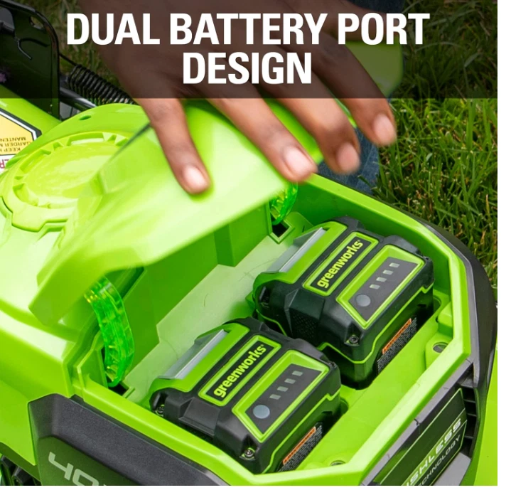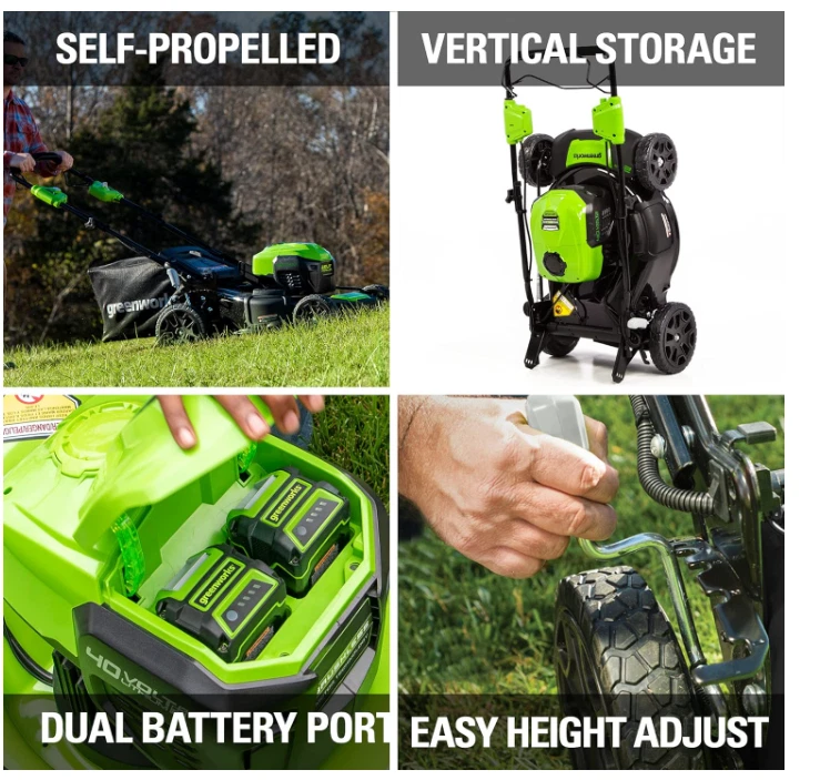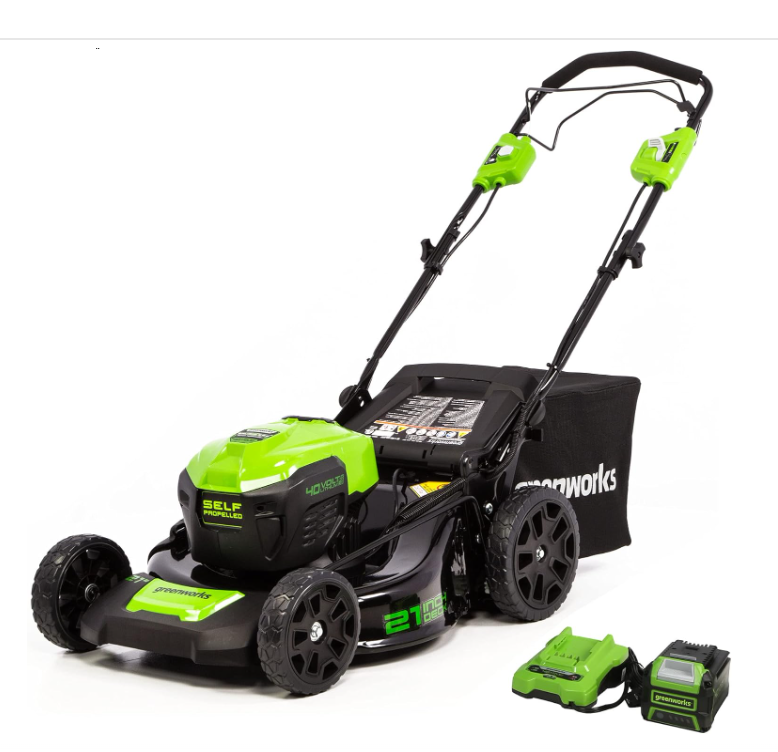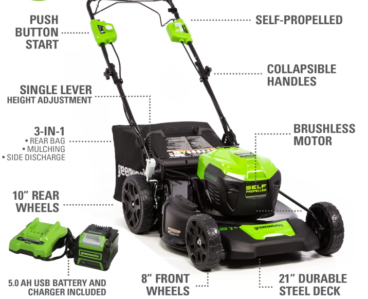 Greenworks 40V 21" Brushless Cordless (Self-Propelled) Lawn Mower (75+ Compatible Tools), 5.0Ah Battery and Charger Included Brand Greenworks Power Source Battery Powered Material Alloy Steel Color Lmf403 Style Mower Item Weight 21.7 Pounds Cutting Width 21 Inches Number of Positions 5, 7 Operation Mode Automatic Product Dimensions 65.35"D x 21.65"W x 33.07"H See more About this item 40V 21” LAWN MOWER - Get more done, faster, with Greenworks electric lawn mowers. This 40V self-propelled lawn mower provides up to 45 minutes of run-time with fully charged 5.0Ah battery (varies based on grass condition and operator technique).Front wheels : 8 Inches BRUSHLESS MOTOR / DURABLE STEEL DECK - This electric mower features a durable 21" deck, and a highly efficient brushless motor that provides more torque, quiet operation, and longer life SINGLE LEVER HEIGHT ADJUST - 7 position height adjustment provides the best cut in all environments. 3-in-1 design offers rear bag, side discharge, and mulching capabilities SELF-PROPELLED - Rear wheel drive power increases traction to tackle the toughest backyard terrain VERTICAL STORAGE - Save 70% more space with vertical storage MAINTENANCE FREE - The walk behind lawn mower is virtually maintenance free, with no gas, no oil, and no emissions. It starts instantly, is quiet, and delivers the power you need