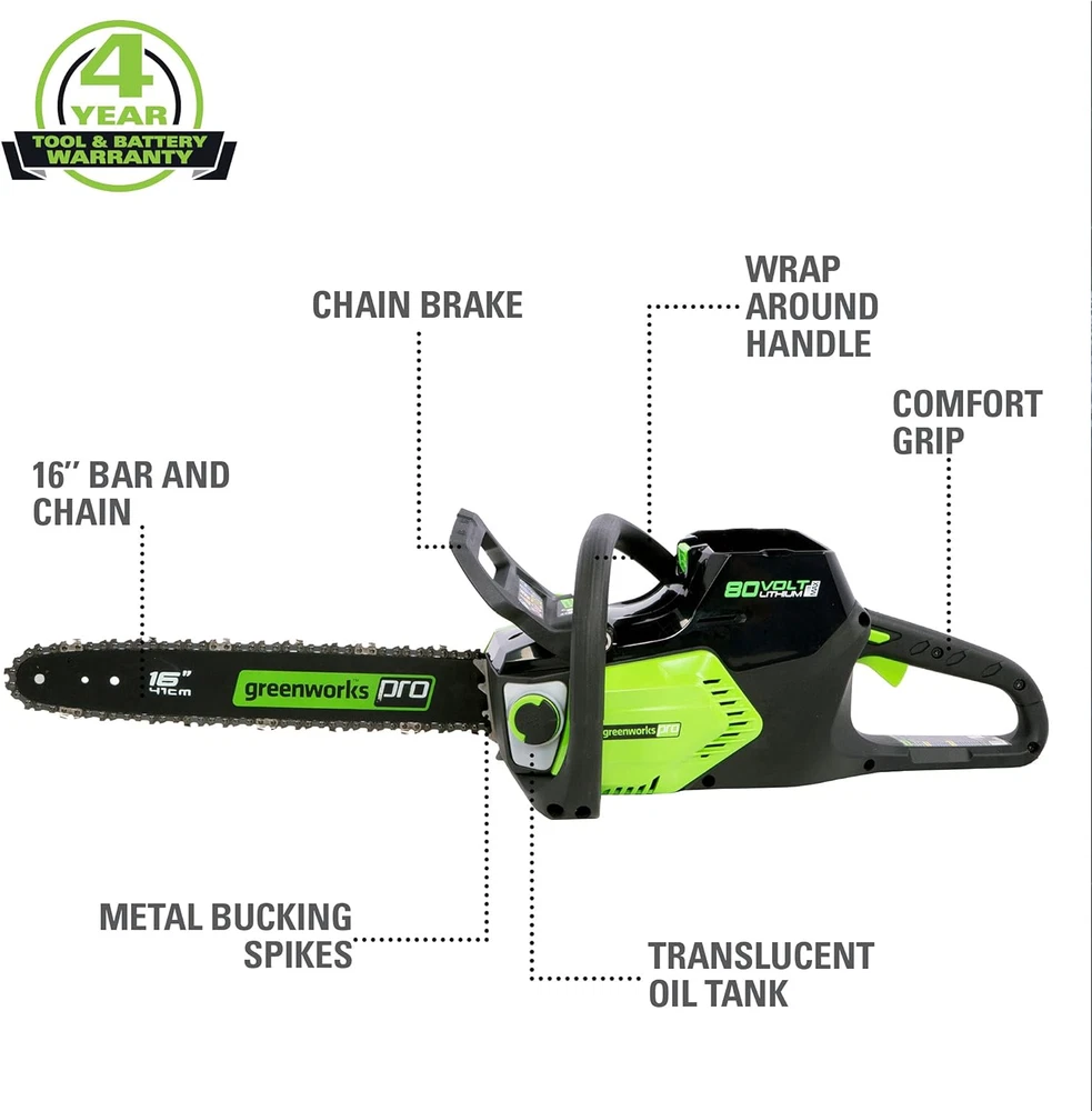 Store New Arrivals Add to Favorite View Feedback Contact Greenworks 80V 16" Brushless Cordless Chainsaw (Great for Tree Felling, Limbing, Pruning, and Firewood / 75+ Compatible Tools), 2.0Ah Battery and Charger Included Description Item model number CS80L211 Part Number CS80L211 Style 2AH Battery and Charger Product Dimensions 30.12"L x 9.7"W x 9"H Power Source Battery Powered Item Package Quantity 1 Item Weight 12.8 Pounds Pattern Chainsaw Brand Greenworks Country of Origin China Battery Cell Type Lithium Ion Global Trade Identification Number 00841821026103 Manufacturer Greenworks Batteries 1 Lithium Ion batteries required. (included) Batteries Included? Yes Batteries Required? Yes Horsepower 3.6 hp Size 16" (2.0Ah) Chain Length 16 Inches Included Components Battery and Charger MAXIMUM EFFICIENCY: Achieve up to 100 cuts on 4x4 lumber using a single charge from the included 2.0Ah battery, ensuring uninterrupted performance. VERSATILE CUTTING POWER: The 16-inch bar and chain effortlessly handle trees and limbs up to 30 inches in diameter, offering a wide range of cutting possibilities. SUPERIOR BRUSHLESS MOTOR: Benefit from enhanced torque, extended runtime, and prolonged tool life with advanced brushless motor technology, comparable to a 45CC gas chainsaw. INSTANT, HASSLE-FREE START: Experience a guaranteed start every time with no need for priming, choking, or pulling. EFFORTLESS MAINTENANCE: The pro-style side-mounted chain tensioning feature simplifies bar and chain maintenance, making upkeep a breeze. SUSTAINED LUBRICATION: The automatic oiler ensures consistent chain lubrication, promoting a longer chain life. The transparent oil window provides clear refill indications. ENHANCED SAFETY: The inertia-activated chain brake adds an extra layer of safety, stopping the chain during kickback to reduce the risk of injury. Experience effortless landscaping with the Greenworks PRO 80V Max System, the most powerful cordless battery platform for outdoor power equipment. Breeze through residential properties, corporate parks, and entertainment venues with zero gas, zero emissions, and zero maintenance. Simply press a button to unleash power that delivers less vibration, less noise, and less mess. With extra batteries, a rapid charger for quick charge times, and multi-tool compatibility, you can complete all your landscaping tasks with the power and performance of gas at a lower operating cost. Transform your work and your life with Greenworks PRO 80V Max System. ABOUT US We offer the best prices around on high quality products. Our E-store includes media such as books, movies, music and games while offering electronics, toys, sporting apparel, clothing, tools, general home, garden items and more. SHIPPING We are always working hard to ensure your package arrives as soon as possible. Please understand that some factors like weather, high postal traffic, and the performance of shipping companies are outside of our control. We offer free shipping to the lower 48 states and ship within 5 business days of payment, usually sooner. We do not accept P.O. Boxes. Please provide a physical address. For shipping outside of the continental USA, we only use eBay's Global Shipping Program.The item is shipped to KY and then sent to the rest of the world. International customers are responsible for all duties and taxes. Continue to check out in order to calculate costs for shipping the item to your country. Messages regarding eBay's Global Shipping Program MUST be directed at eBay EXCLUSIVELY. RETURNS We offer a 30-Day Return Policy on items which you are not completely satisfied with. You have the option for a full-refund or an exchange of the item. No returns are available on items shipped outside of the USA. PAYMENT We accept PayPal. CONTACT US This page content is yet to come Please ad us to your favorite seller and visit again later Thank You CUSTOMER SATISFACTION We try our very best to make sure every customer is completely satisfied. If there's a problem, message us! We're happy to help. WE ACCEPT Copyright © 2021 AutoDS. | All Rights Reserved