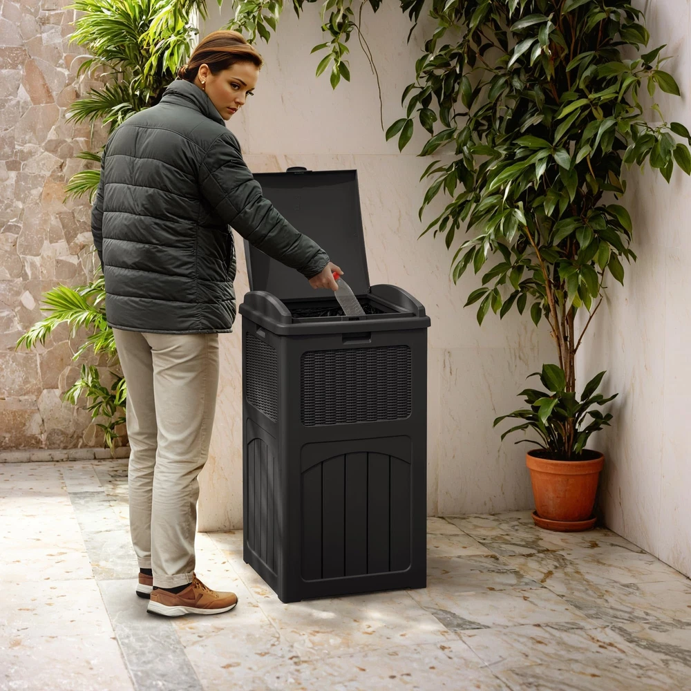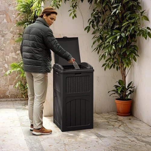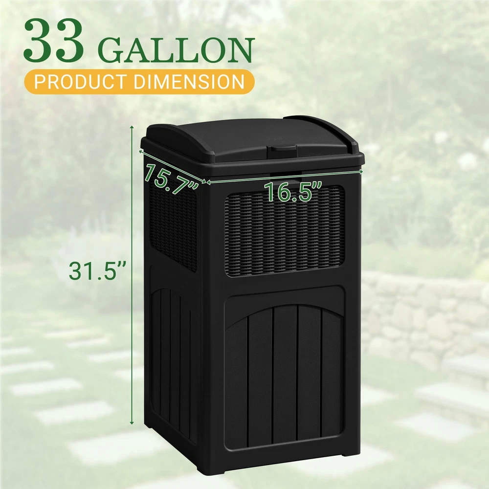 Greesum 33 Gallon Outdoor Trash Can for Patio Feature: The trash is in imitation rattan weaving design. Made of high quality resin material, the trash can is waterproof and UV proof. And it is suitable to be used as a mailbox. Specification Color: Black Package Dimensions: 31.69"(L) x 17.72"(W) x 7.87"(H) Package includes: A trash bin A manual of installation and usage Notice: There may be some differences between photos and items in term of color, because of the influence of lighting during the shooting or the settings of the computers’ display screen. Outdoor Patio Trash Can: Designed with imitation rattan weaving patterns, this outdoor waste bin not only looks beautiful, but also has strong practical functions. It is waterproof, UV-resistant, fade and warp-resistant, and can meet the needs of different scenarios Multi-Functional Use: This resin outdoor trash can withstand the effects of various outdoor elements, preventing the entry of water and dust. It can also be used as an outdoor storage bin, suitable for patio, swimming pool and other multi-scenario use needs Large Storage Space: This trash can has a storage capacity of 33 gallons and measures 16.5”(L) x 15.7”(W) x 31.5”(H). It can fit garbage bags in 30-33 gallon Dual Lid Desin: On the top, there is a securely latched lid, and you can easily open it by simply pressing the position with the logo “press” printed. You can easily change the garbage bag by lifting the external lid. Also, the external lid holds the trash bag in place so it won't move around easily Easy to Assemble: The trash can is easy to assemble within 10 minutes with no screws needed