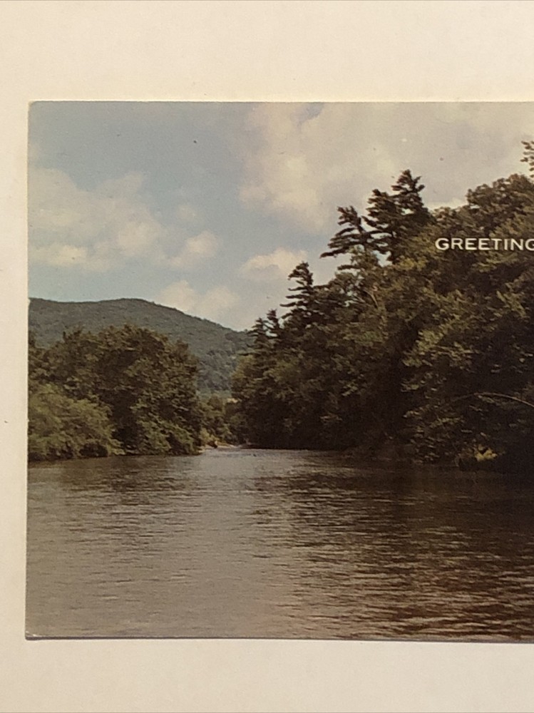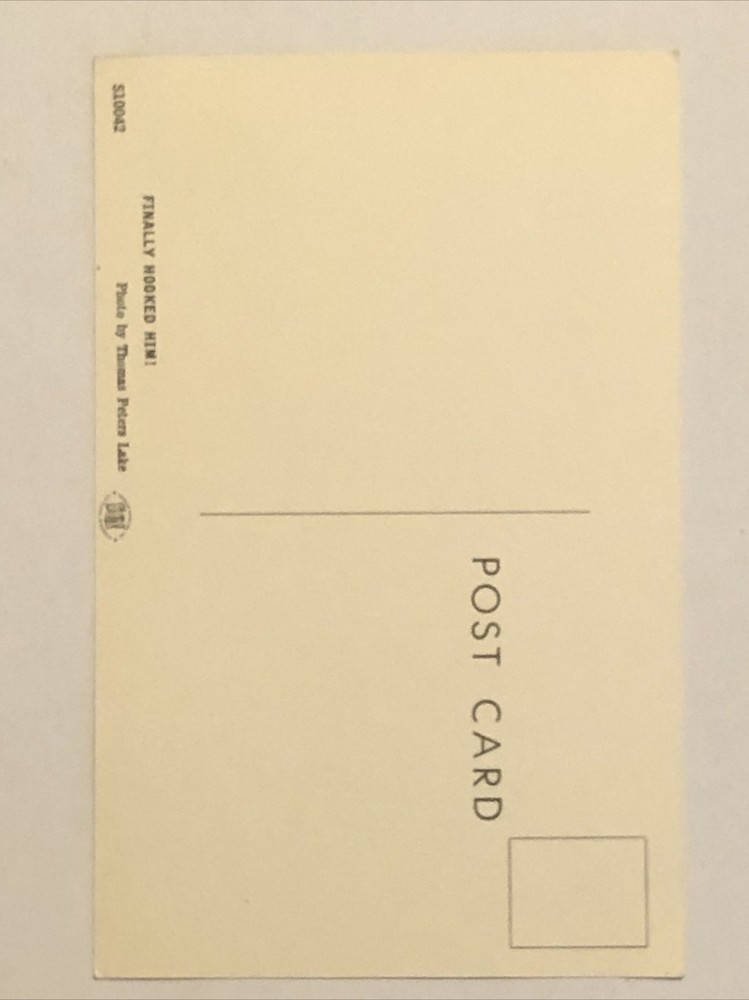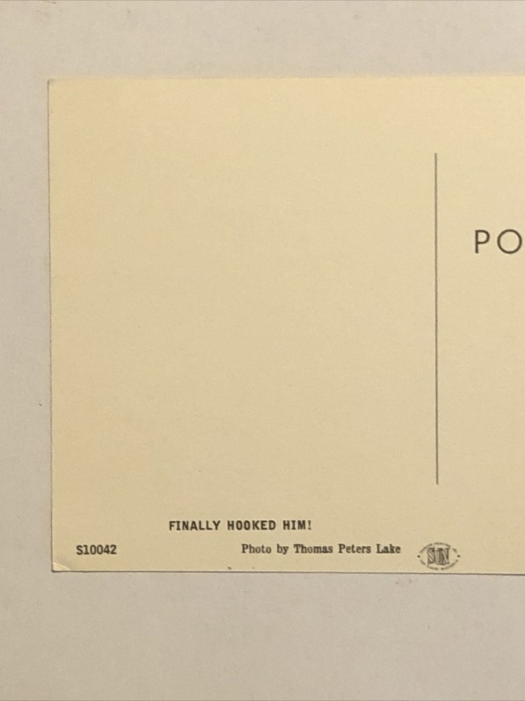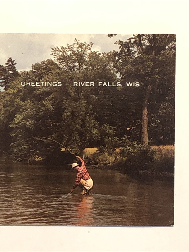 Vintage postcard featuring a panoramic view of River Falls, Wisconsin, USA. The postcard depicts a fishing scene with a fisherman finally hooking a fish. Printed in lithograph style on standard-sized paper, it is an original piece from the Chrome era. The postcard is unposted and showcases the theme of US States, Cities & Towns, specifically highlighting the city of River Falls in Wisconsin.
