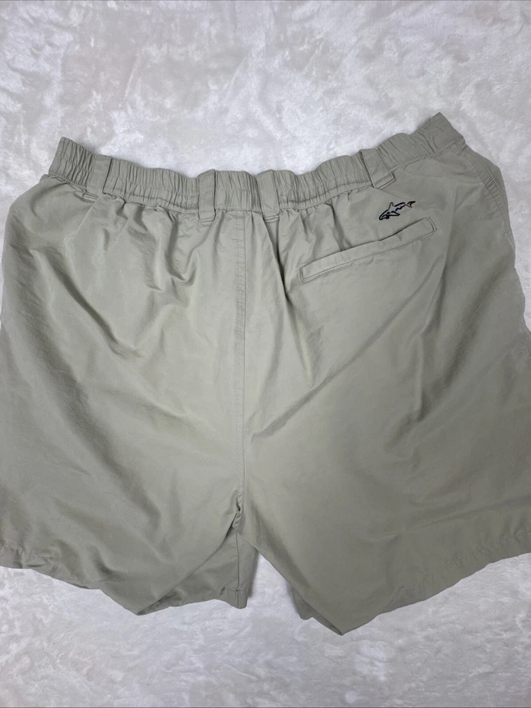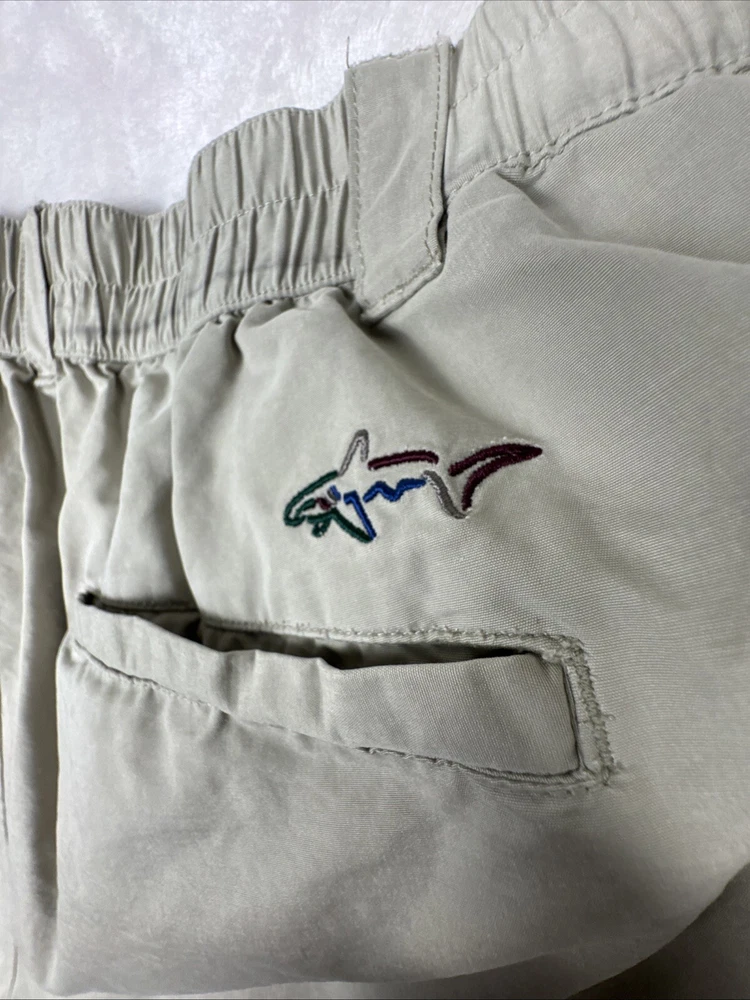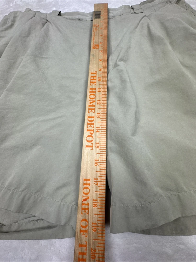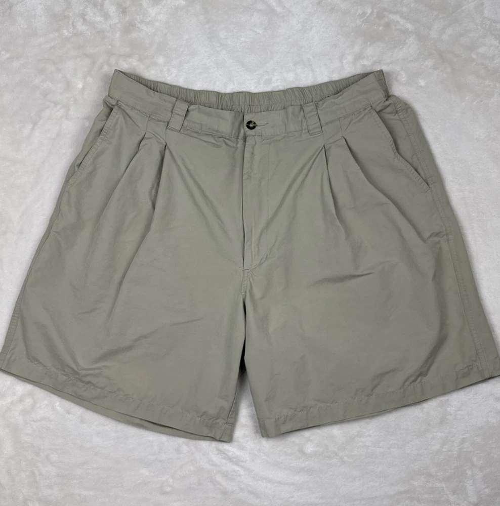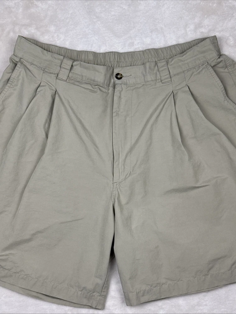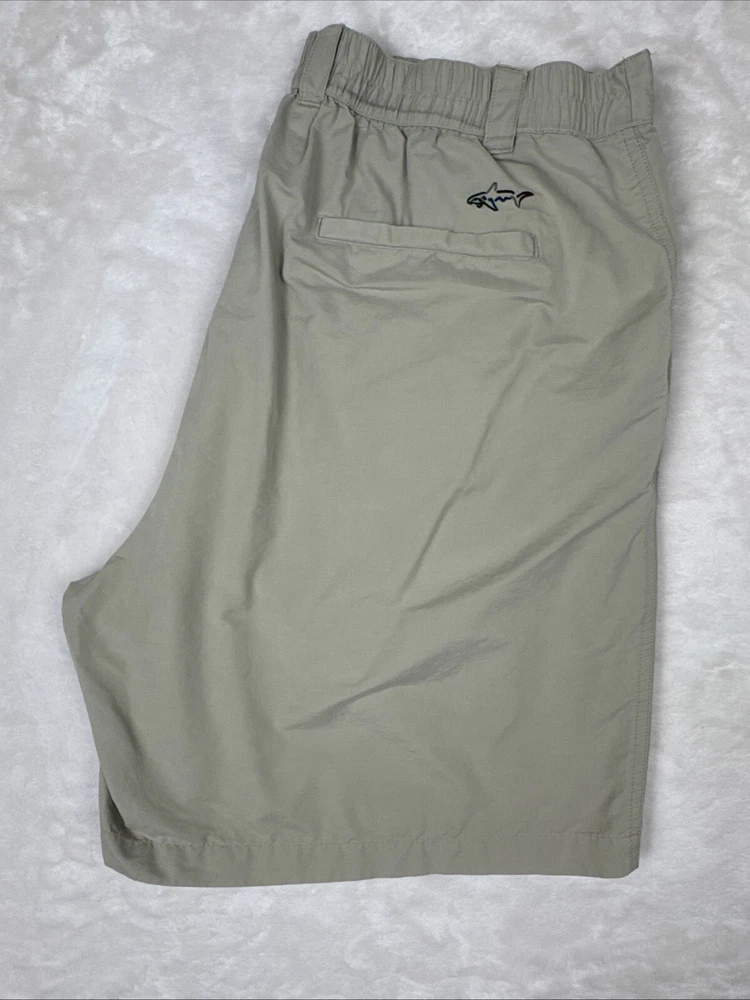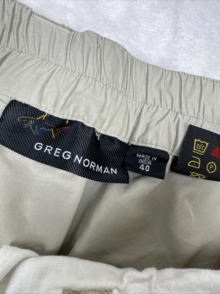 Men's Greg Norman khaki golf shorts in size 40 with a 9-inch inseam. These Bermuda-style shorts feature a pleated front and elastic stretch waist for comfort. Made of light wash cotton canvas fabric, they have a classic fit and solid beige color. Feel free to message me with any questions or requests for additional pics!