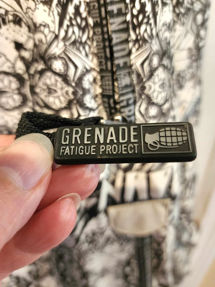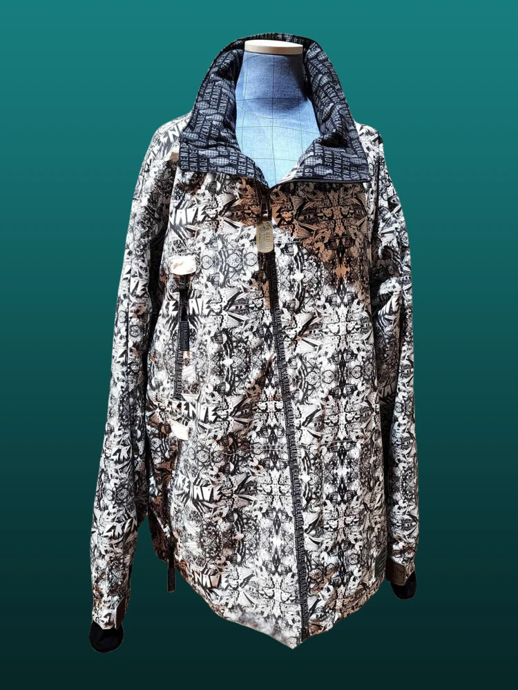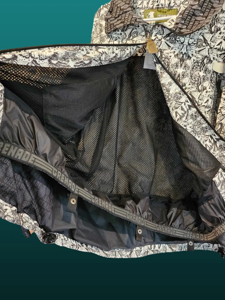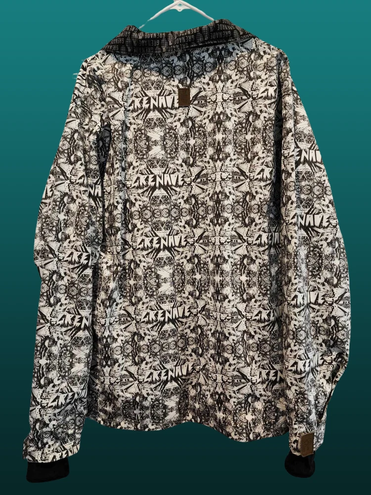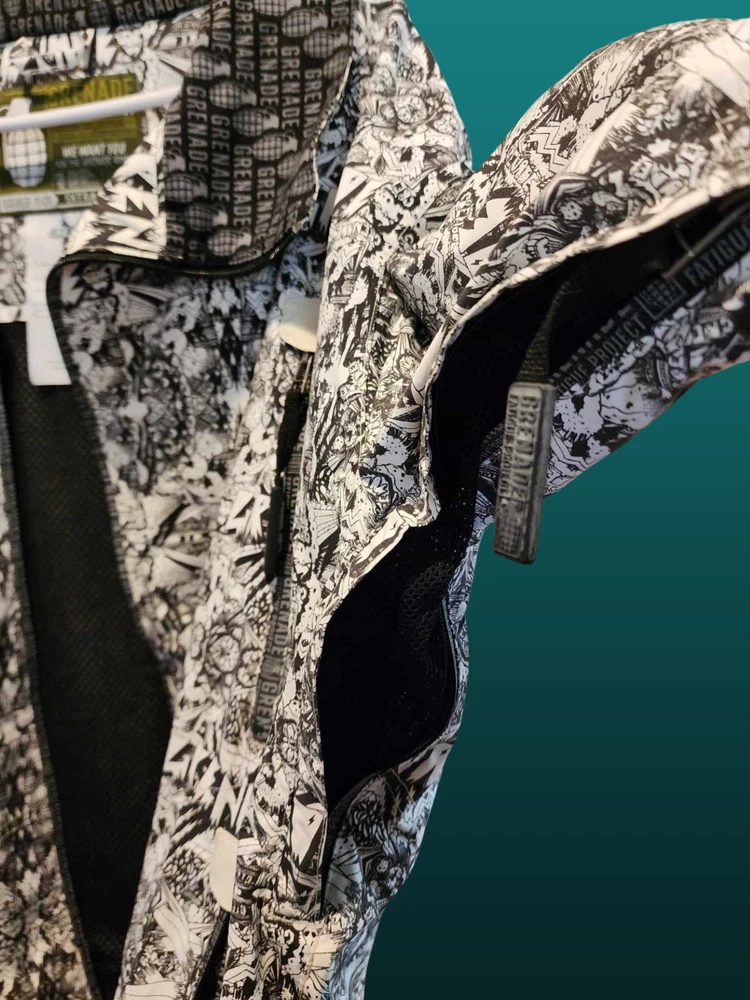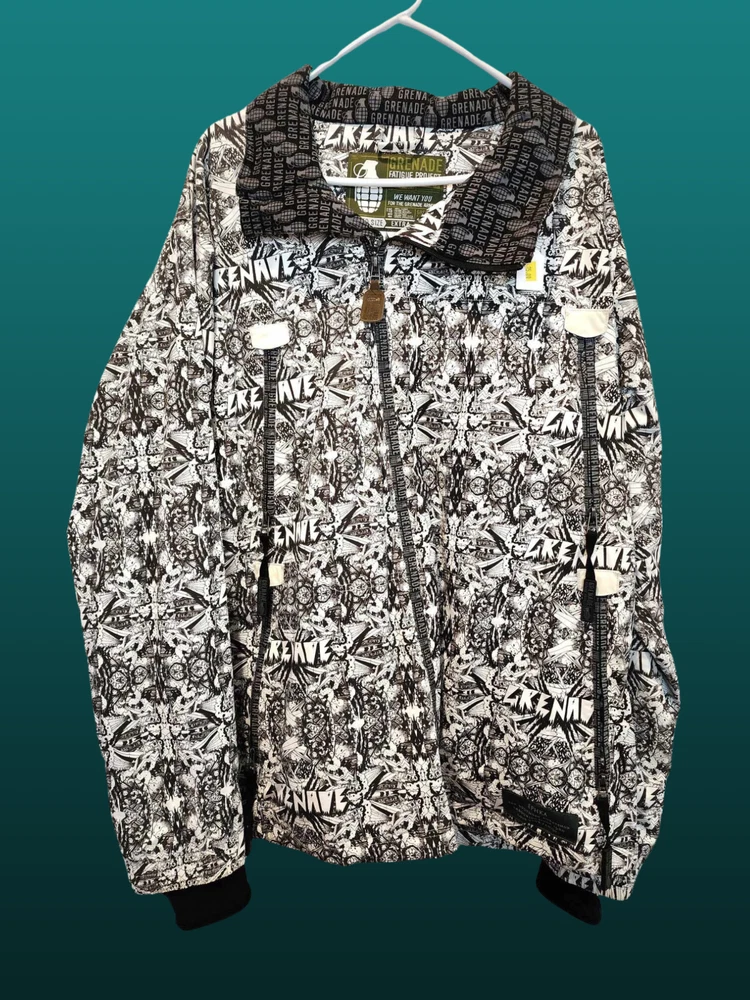 This Grenade Fatigue Project Y2K Full Zip Activewear Jacket is the perfect addition to any action-sports enthusiast's wardrobe. The jacket is made of softshell nylon fabric that is breathable and water/wind resistant, making it ideal for winter, fall, and spring seasons. The jacket features a stand-up collar which can also be turned down, 5 zipped pockets, and a limited edition design with the limited edition Grenade Army Membership product line. The jacket is designed with a full zip closure, snap accents, and underarm ventilation ports, technical cuffs and is available in men's size XL. It is machine washable and comes in mid-length with an all-over black and white pattern. This jacket is perfect for skiing, snowboarding, and skateboarding, and is a must-have for anyone who wants to look stylish while staying comfortable and protected from the wind and water. This jacket is an exclusive line from Grenade Gloves when you join their "Grenade Army" paying a membership. This jacket is similar to the collaboration with the band The Misfits and their jacket featuring black & white Misfit printing. Measurements: Shoulder to hem (front): 32.5" Shoulder to hem (back): 32.25" Shoulder to cuff: 35" Pit to pit: 27"