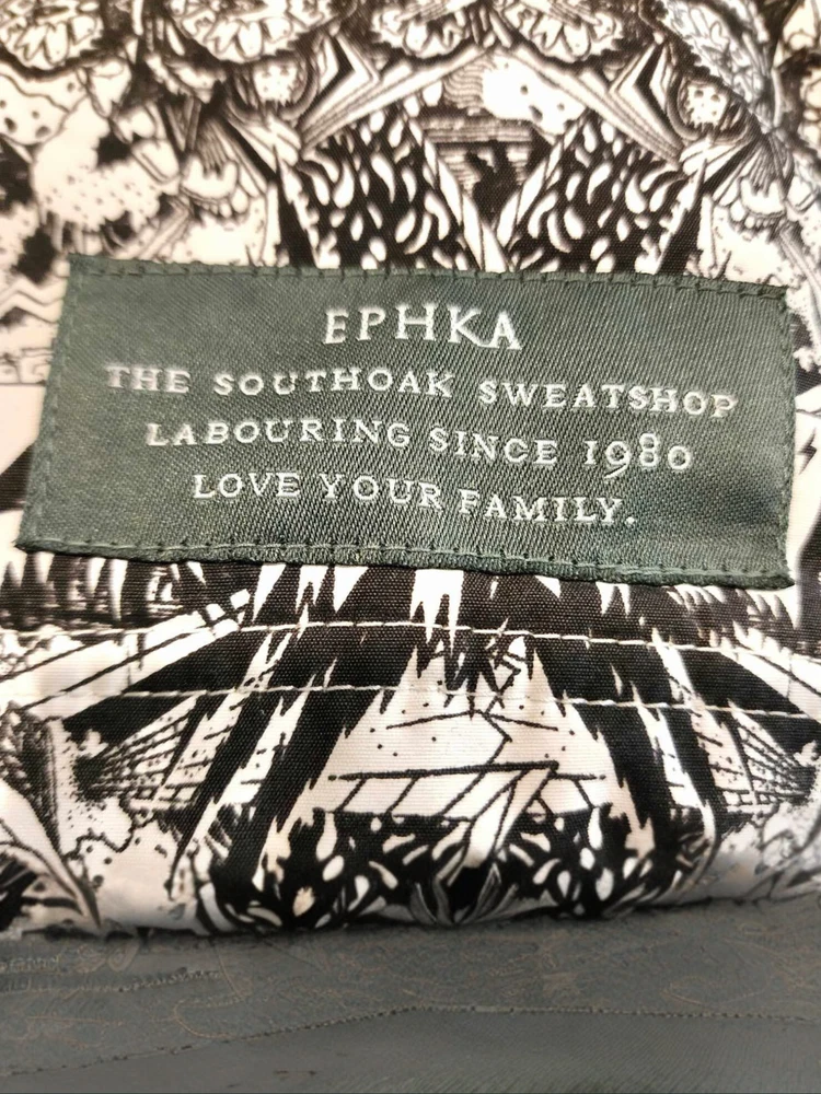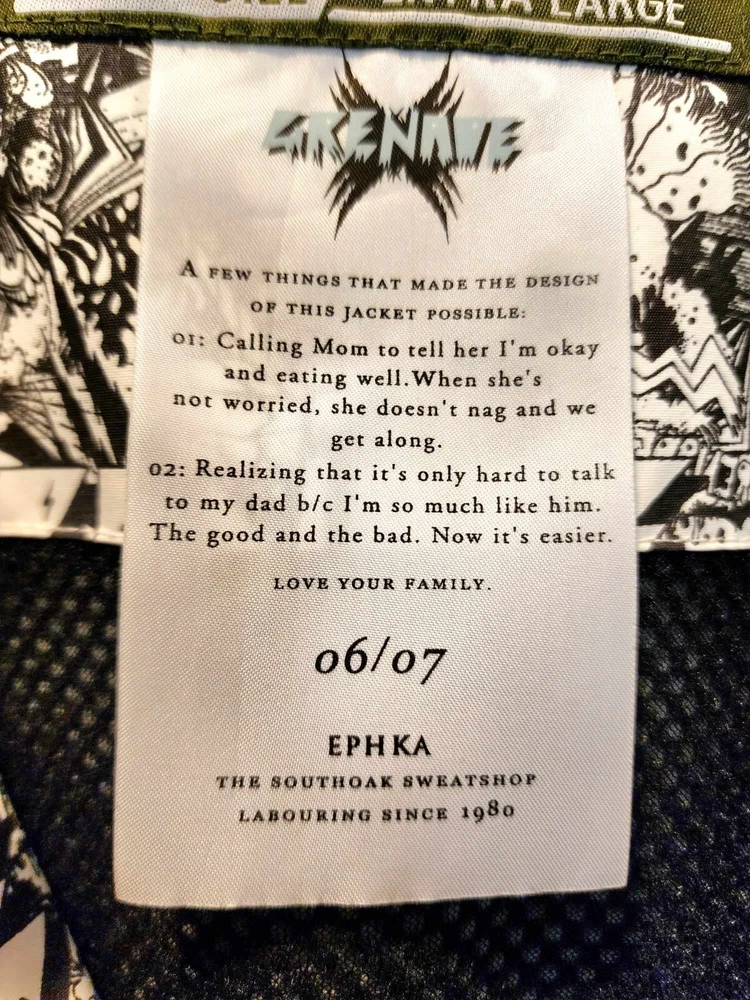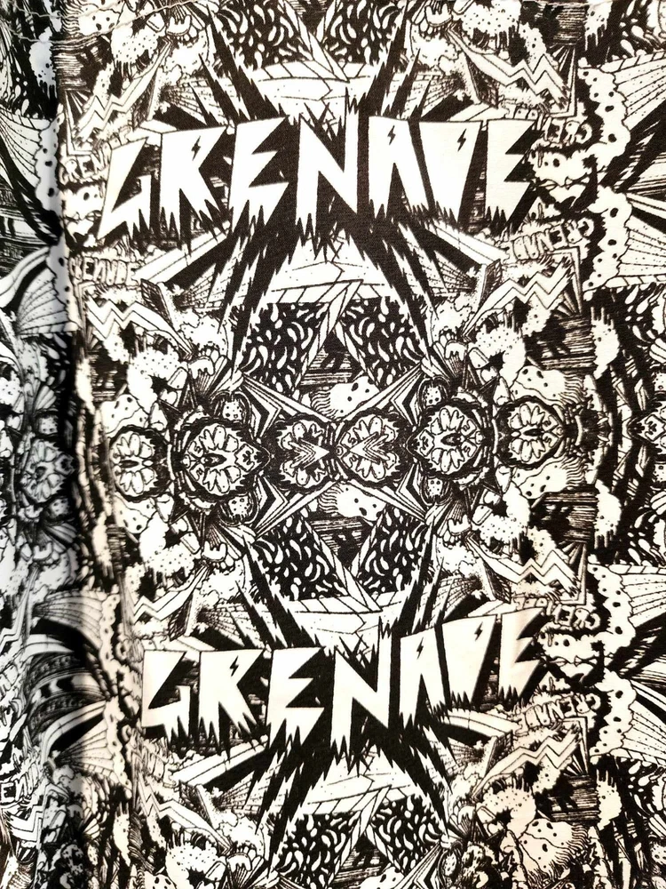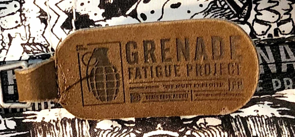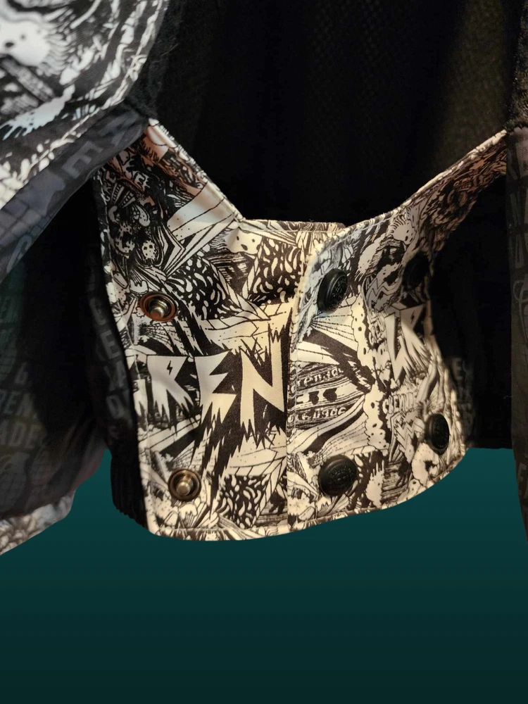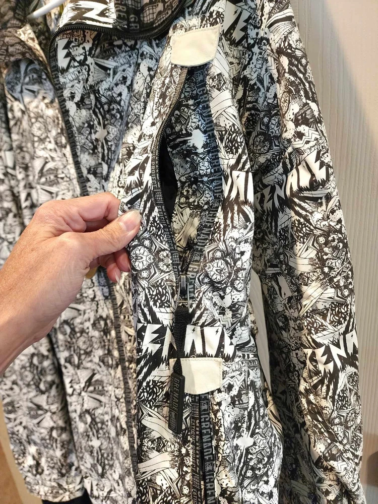 This Grenade Fatigue Project Y2K Full Zip Activewear Jacket is the perfect addition to any action-sports enthusiast's wardrobe. The jacket is made of softshell nylon fabric that is breathable and water/wind resistant, making it ideal for winter, fall, and spring seasons. The jacket features a stand-up collar which can also be turned down, 5 zipped pockets, and a limited edition design with the limited edition Grenade Army Membership product line. The jacket is designed with a full zip closure, snap accents, and underarm ventilation ports, technical cuffs and is available in men's size XL. It is machine washable and comes in mid-length with an all-over black and white pattern. This jacket is perfect for skiing, snowboarding, and skateboarding, and is a must-have for anyone who wants to look stylish while staying comfortable and protected from the wind and water. This jacket is an exclusive line from Grenade Gloves when you join their "Grenade Army" paying a membership. This jacket is similar to the collaboration with the band The Misfits and their jacket featuring black & white Misfit printing. Measurements: Shoulder to hem (front): 32.5" Shoulder to hem (back): 32.25" Shoulder to cuff: 35" Pit to pit: 27"