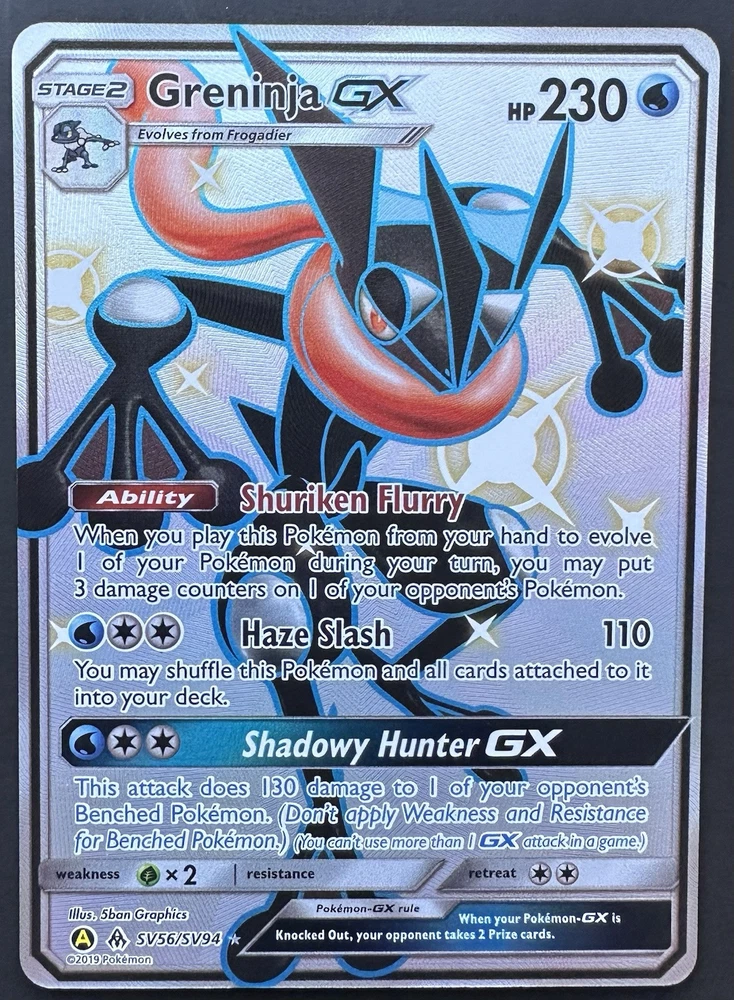 The product is a Greninja GX card from the Hidden Fates: Shiny Vault set of the Pokémon Trading Card Game. Released in 2019, this English-language card has 230 HP and is a Shiny Holo Rare. It is a Stage 2 Pokémon card with card number SV56/SV94, featuring a holographic finish.