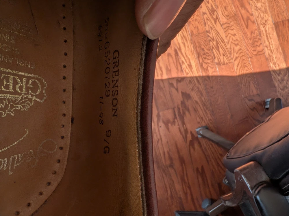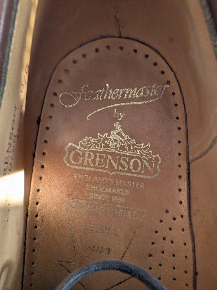 The Grenson shoes are stylish men's dress shoes, made in England with brown leather upper material. They feature a classic Oxford style with a wingtip design, standard shoe width, and leather outsole. The shoes are in UK size 9, equivalent to a US size 10, making them a versatile and high-quality option for any formal or professional occasion. shoe trees not included.