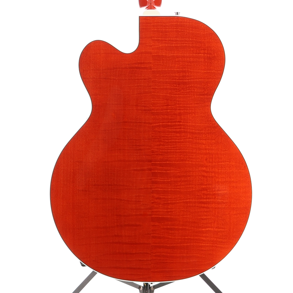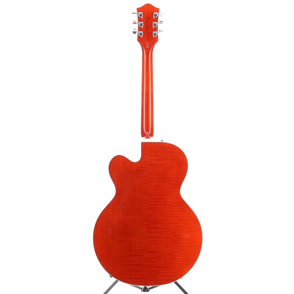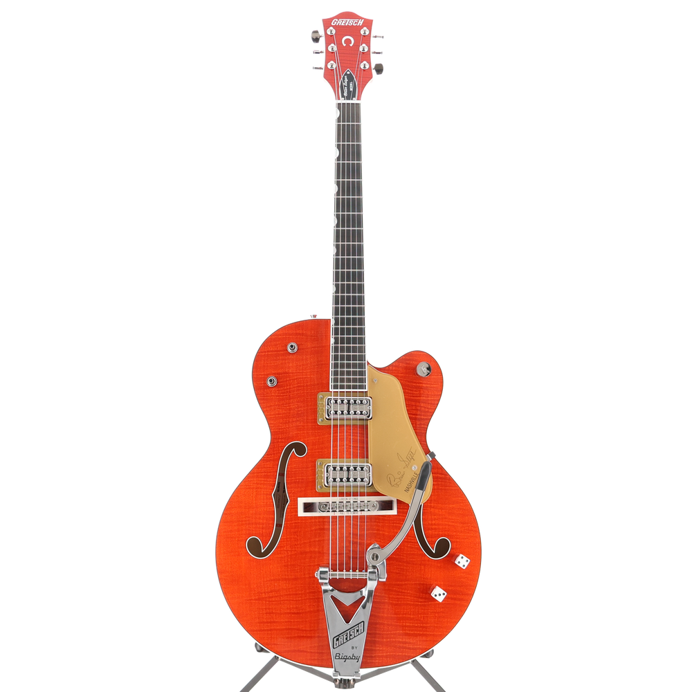 Weight 6lbs 15oz Up for sale is a Gretsch G6120TFM-BSNV Brian Setzer Signature. This one came to us in great shape! The electronics have been play tested and working as they should. There may be some very light surface scratching but is in overall excellent condition. This one comes with a case By spearheading the rockabilly revival with the Stray Cats and jump-starting Big Band Swing with the Brian Setzer Orchestra, Brian Setzer has created a remarkable and lasting legacy. His decorated career includes over 13 million records sold, three Grammy Awards and the Orville H. Gibson Lifetime Achievement Award in honor of his work as a guitarist. Without a doubt, the longtime signature Gretsch artist is one of the most exciting musicians of our time.Gretsch is thrilled to be a part of Setzer's pivotal legacy with the G6120TFM Brian Setzer Signature Nashville Hollow Body with Bigsby and Flame Maple, a truly rocking instrument that boasts as much swagger as the showman who inspired it.The single-cutaway hollow body features tiger flame maple arched top, back and sides with 1959 trestle bracing and oversized F-holes for improved sonic projection. The set maple neck has a 9.5"-12" compound radius ebony fingerboard with rolled edges for comfortable chording or speedy riffing across 22 medium frets and pearloid Neo-Classic thumbnail inlays. Dual TV Jones Brian Setzer Signature Filter'Tron pickups deliver tight and punchy lows with a slightly hotter output that captures Brian's iconic lively tone.Other performance-enhancing features include period-correct control locations with a three-position pickup toggle switch, three-position tone switch, master volume control with treble bleed circuit and individual bridge and neck pickup volume controls, Adjusto-Matic bridge with pinned rosewood base, Bigsby B6C vibrato tailpiece, Delrin nut and Gotoh locking tuning machines.The G6120TFM in Orange Stain duly impresses with a period-correct gold pickguard shape, size and bracket, white body and neck binding, nickel hardware and G-arrow knobs. SKU:2401316822 Franklin Guitar Works - Who We Are FGW is a division of MIRC, LLC (Musical Instrument Reclamation Corporation), located in Franklin TN. MIRC is the world's largest refurbisher of stringed instruments. We partner with the leading manufacturers in the industry, helping them recondition their distressed instruments. All of our instruments have been inspected, set up, and refurbished by our certified technicians to ensure you are receiving a quality instrument. Hours of Operation Our online Business hours are Monday - Friday 7:30 am to 4:00 pm CST. Closed on weekends and holidays. Shipping Policy Free ground shipping within the continental USA. Items under $20 will have a $9.95 shipping charge. We do not offer international shipping. We cannot ship to a PO Box. Orders require a physical mailing address to be processed. All orders over $500 will be shipped with a direct Signature Requirement to ensure it is received. If the signature requirement is refused, the customer will assume responsibility for the package once it reaches the delivery address. Orders are processed Monday through Friday, 7:30am - 4:00pm CST. Shipments are prepared in the order that they are received. We make every effort to expedite orders as quickly as possible, but we cannot guarantee ship dates. Please allow up to 3 business days for tracking information. Thank you for your business!