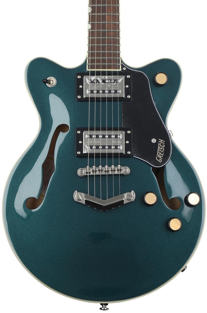 Get into This High-gain Gretsch Sweetwater is an Authorized Gretsch + Fender Dealer Genuine New Item Sweetwater's 2-year warranty Gretsch 2817100533 + Fender 0239978005 + Fender 0990662080 + Fender 0980300 Semi-hollowbody Electric Guitar with Laminated Maple Top, Back, and Sides, Nato Neck, Laurel Fingerboard, and 2 Humbucking Pickups - Midnight Sapphire Poly-web Guitar Strap with White Embroidered Fender Logo - Black Celluloid Standard Guitar Picks, Medium Gauge - Assorted Colors, 12-pack Clip-on Headstock Tuner with LCD Display and Vibration Sensor - Black Get into This High-gain Gretsch Gretsch's G2655 Streamliner Center Block Jr. Double-Cut semi-hollowbody electric guitar was built for players looking for an affordable guitar that blends that identifiable Gretsch sound with high-gain rock tones — all while sporting a smaller and more streamlined body size! Two high-output, custom-wound Broad'Tron BT-3S humbucking pickups effortlessly push amplifiers into overdrive, while the spruce center block in the body resists feedback at loud volumes. Need single-coil character? Just pull up on its master volume control for coil-splitting convenience! Add an anchored Adjusto-Matic bridge with V-Stoptail into the equation, and this axe keeps your tuning locked down tight. Across the board, the G2655 Streamliner showcases a wonderful blend of old-school personality and new-age tonal dexterity that will perfectly satisfy the sonic visions of classic rockers and contemporary songwriters alike. Classic Gretsch appearance The G2655 Streamliner Center Block Jr. Double-Cut sticks close to what has made Gretsch guitars look so desirable over the years. A pair of F-holes divulges the guitar's semi-hollowbody construction, with a slightly smaller double-cut body shape that is very comfortable to play for longer gigs. It also comes decorated with vintage-vibed, multi-ply binding that wraps the entire instrument. And the chrome hardware and pearloid Neo-Classic inlays ensure the G2655 Streamliner will look as great onstage as it does hanging up in Sweetwater's Music Store. Versatile tones, from vintage to modern Leveraging vintage-style construction and a modern electronics package, the G2655 Streamliner delivers tones that will fit just as well with a low-wattage rockabilly band as they will through a high-gain amp stack. On a foundational level, its semi-hollow design adds warmth and clarity to the guitar's overall tone. But make no mistake: when cranked, its high-output, custom-wound Broad'Tron BT-3S humbucking pickups are engineered to deliver screaming rock and fusion tones. Unleash even greater degrees of expression with a push-pull master volume control to instantly access some serious single-coil attitude. To boot, any and all feedback is kept nicely under control via the body's center block. Built with the player in mind Gretsch's G2655 Streamliner plays and feels every bit as good as it sounds. Its soft C neck profile is round enough that chording remains comfortable in all positions, while being thin enough to facilitate fleet-fingered single-note runs. The thinline, double-cutaway construction is comfortable against your body, and it gives you unimpeded access to the guitar's highest frets. And the controls have even been thoughtfully laid out to prevent hindrance of your picking hand. Gretsch G2655 Streamliner Center Block Jr. Double-Cut Features: Double-cutaway semi-hollowbody guitar with slightly smaller body shape offers superior playing comfort 2 powerful and dynamically versatile Broad'Tron BT-3S humbuckers Push-pull master volume control instantly unleashes characterful single-coil potential Semi-hollow design adds warmth while resisting feedback Anchored Adjusto-Matic bridge with V-Stoptail promises performance-grade intonation Soft C neck profile maximizes comfort while accommodating numerous play styles Vintage-inspired aesthetics ensure flexible use in both songwriting and performance Fender Accessories guitar and bass straps are made to give you great performance, durability, and comfort. Fender has been an icon in the music world for more than a half-century, and their commitment to quality extends to everything they make, from guitars to amps to accessories. Fender Accessories straps are made from the best materials available, and there's a strap that's sure to fit your style. When you want to play with confidence and comfort, it makes sense to go with a proven performer — choose a genuine Fender Accessories strap! This Fender Accessories Poly-web guitar strap is a very comfortable and affordable. It includes an embroidered white Fender logo. Fender Accessories Poly-web Strap Features: Color: Black Tough enough for any gig Comfortable 2"-wide strap Poly-web material Fender logo embroidered in white Adjustable Play with a proven performer — choose Fender Accessories! NOTE : This product is available in the United States only - no international sales. Classic Picks to Start Your Journey Both fresh and seasoned guitar players will love Fender’s Celluloid Medley guitar picks. Guitarists familiar with Fender’s line of guitar picks will immediately recognize these classic color schemes; many of these were played by us in our formative years of guitar study! Fender's warm, round-toned plectrums offer a classic-feeling experience with a smooth texture that effortlessly glides across your strings as you play — equally appealing to beginner and veteran players everywhere. Guitar players here at Sweetwater immediately reminisced about their early days of playing upon seeing these picks, citing their warm tone and overall durability. These Fender Celluloid Medley guitar picks are available in three thicknesses with sleek, vibrant colors to accommodate your playing and fashion style. Fender Celluloid Medley Picks Features: 12 classically designed picks with familiar color schemes from Fender’s history of guitar picks Celluloid material provides a warm, round musical tone to your pl