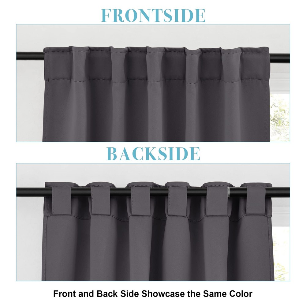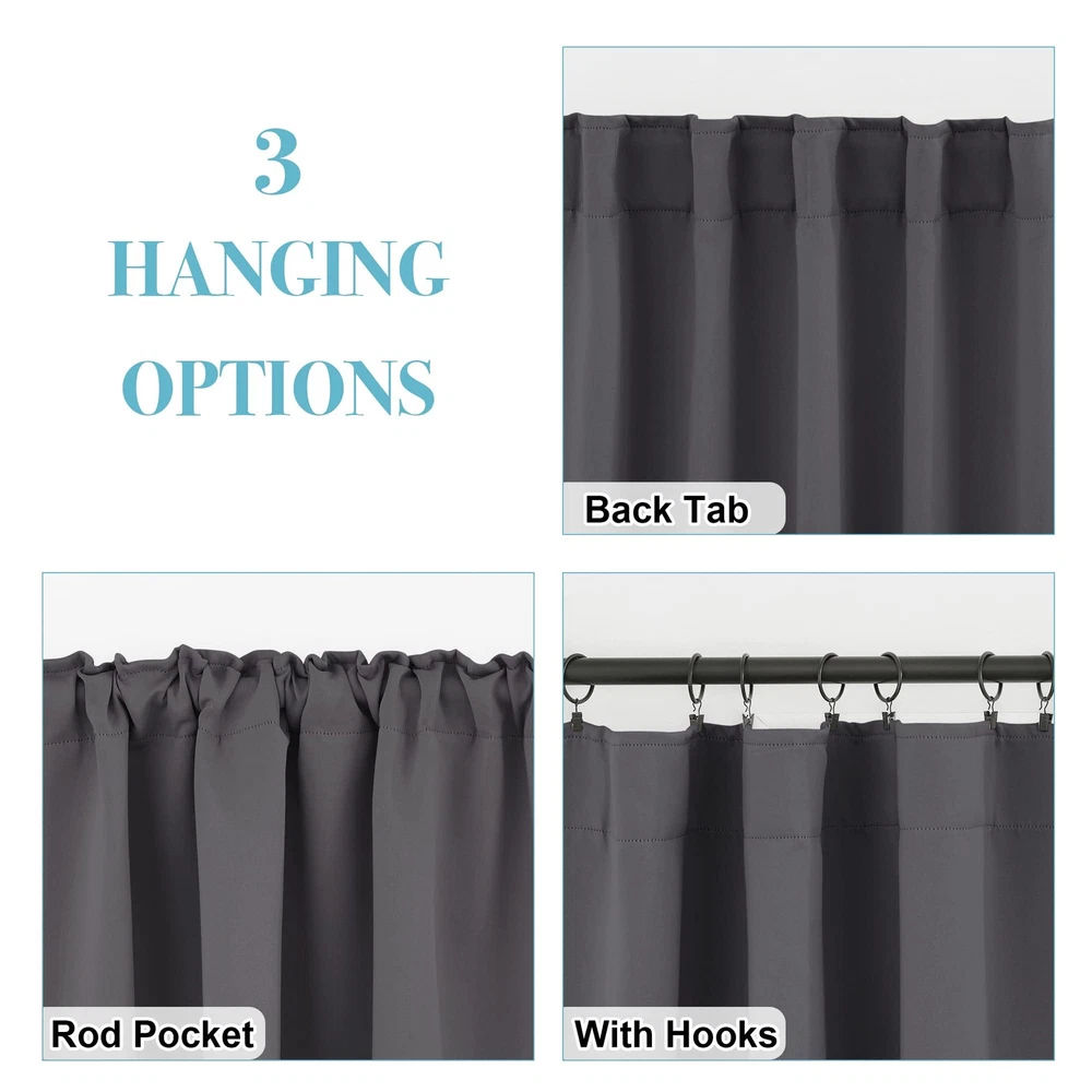 Back Tab & Rod Pocket Blackout Curtains are the perfect addition to an interior filled with pale walls. Created with practicality, these blackout curtains panels do well to your home and office. DETAIL INFORMATION Available in a range of size and color options. Made of 100 % high quality soft durable polyester. Sold as 2 panels, each mesures 42" width,total width is 84 inch. Each curtain panel has back tab & slot top, universal fit to most of rods and available in 2 hanging options. KEY PRODUCT FEATURES Block 85-95% sunlights(Dark color works better). Stop the sight outside to maximum ensure the privacy. Add thermal efficiency to ensure that the room temperature is regulated. Reduce some noise for a peaceful environment. Energy saving by protecting furniture from exposing to the sun. Super soft soft drapery add a wonderful touch. HEADER TYPE 2 header types ( back tab & rod pocket ) make our draperies fit easily to standard curtains rods with differents styles. The headinng tape makes it easy to creat pleats using with rods / hooks / rings. EASY TO MAINTIEN Machine washable Quick ironing or steam cleaning HINTS Due to different computer/screen display, the color of the actual item may slightly different from the above images. is always looking forward to serving our clients with warmth and full ranges of services. Please do not hesitate to contact us if you have any queries. READY MADE - Blackout curtains sold as 2 panels, each measure 42" width by 54" length. Curtains can cover windows to full width. The pleated style should be 1.5-2.6 times to your windows. HEADER TYPE - Each panel with 3" pocket and 6 back tab loops, which can be hung in different style: Back Loops, Slot Top or with your Clip-rings. LIGHT BLOCKING - Curtains block 85-99% sunlight (Dark color works better) for maximum privacy and undisturbed sleep, which benefit from the innovative triple weave technology. ENERGY SMART - Thermal property of the blackout curtains ensure that the room temperature is regulated. Energy-saving by protecting indoor furniture from directly exposing to the sun. HEAVY-DUTY - Same material back as the front. Easy to maintain and machine washable. Use only non-chlorine bleach & warm iron when needed. Tumble dry low. Visit to find out more.