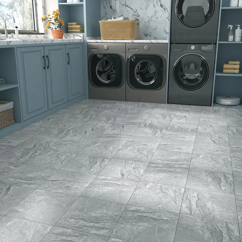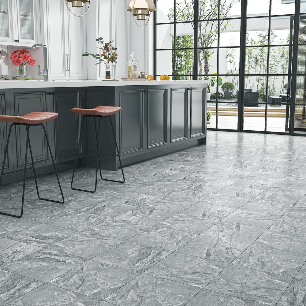 Grey Marble Peel and Stick Floor Tile Elevate your space with gray marble vinyl flooring. Its gray tones and intricate texture mimic the luxury of natural marble, adding a touch of grandeur to any room. It's perfect for modern, minimalist or classic interiors. Transform your space with vinyl floor tile, the ultimate blend of style, durability and affordability. Whether you're renovating your home or upgrading your commercial space, the possibilities are endless with vinyl sheet flooring. Vinyl plank flooring is durable and can withstand the harsh elements of everyday life, resisting scratches, dents, stains. It is ideal for high-traffic areas such as hallways, kitchens and bathrooms, as well as homes with pets and children. Its wear-resistant layer provides an additional protective barrier that can be easily cleaned and maintained with only regular sweeping and occasional mopping. Vinyl floor tiles can be applied to flat, clean and dry floors. Vinyl flooring can be installed over most existing subfloors, including concrete, wood,linoleum and laminate, saving the time and money required for preparation. Vinyl floor tile is easy to install, just peel and stick. It is self-adhesive and requires no glue or complicated tools.In just a few hours, you can have a brand new floor to brighten up your home. Thickened vinyl flooring has been upgraded to a thickness of 0.06 inches. It resists curling and warping, and after gluing it has minimal gaps.It is durable, removable, easy to clean, non - fading, non-slip, waterproof and renter friendly!Vinyl floor tiles are waterproof.It's perfect for cluttered bathrooms or kitchens. If you want to increase its waterproofing, you can apply a silicone sealant to the floor tile joints. TIP : To avoid color variations, order all required vinyl flooring at the same time to ensure they are from the same production batch. 【Size】: Each grey marble vinyl tile is 12"×12", 1.5 mm thick. Set of 4 pcs covering 4 sq. ft 【Realistic Marble Vinyl Flooring】: Gray marble vinyl flooring combines the elegance of natural marble with the practicality of vinyl flooring. Its gray hues and patterns create a realistic marble look that is perfect for both modern and classic interiors 【Waterproof Marble Vinyl Flooring】: Our self-adhesive marble vinyl floor tiles have a waterproof layer that easily prevents spills and splashes. It protects the floor from water damage, keeping it perfect and durable even in wet environments 【Premium Vinyl Flooring】: Made of high quality vinyl material, which is waterproof, non-slip, durable, thick, easy to clean, wear-resistant, non-warping and non-expanding. It removes without sticky residue and is renter friendly 【Versatile Vinyl Floor Tiles】: It is suitable for concrete, ceramic, wood and other floors, stairs, laminates, linoleum,shelves, ceilings, countertops, desks, and can be used to decorate kitchen, living room, dining room, bedroom, bathroom, RV, cubicle