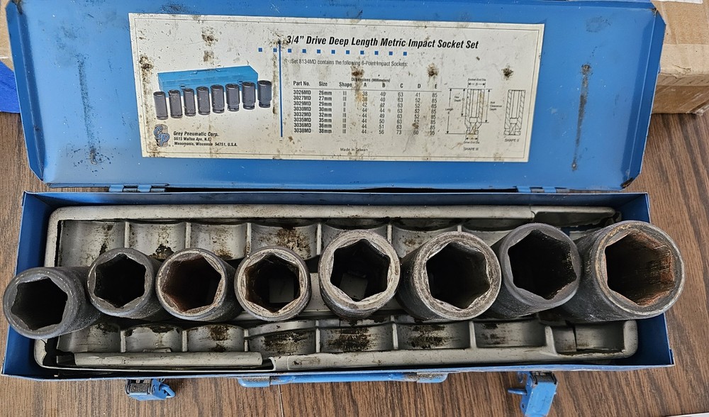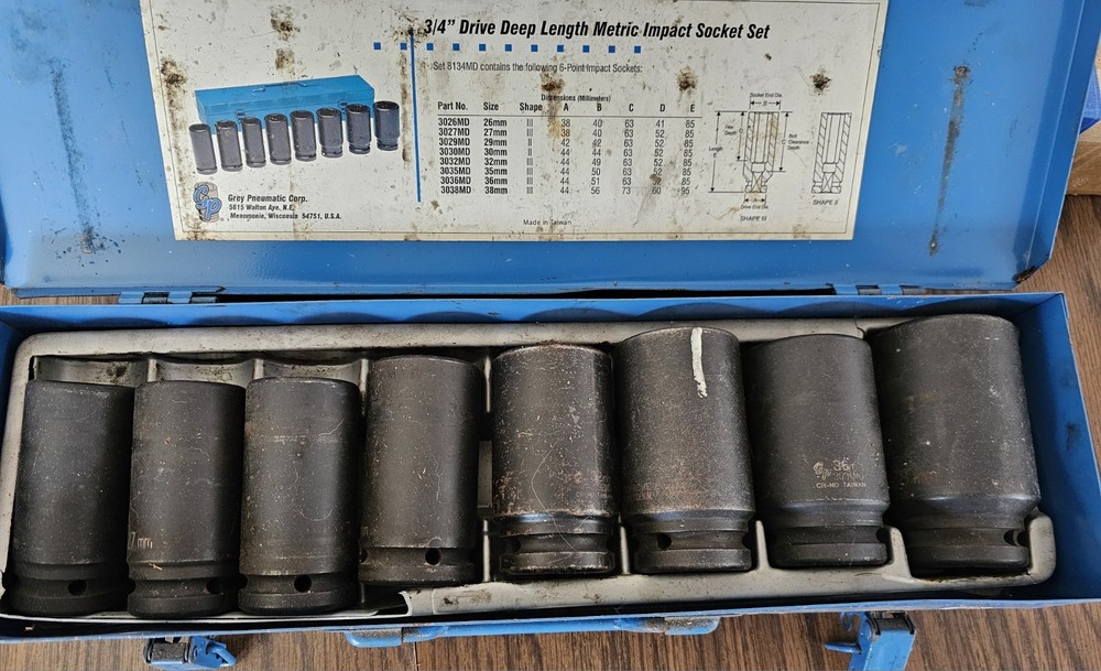 Perfect for your diesel mechanic or big rig owner!!! The Grey Pneumatic 3/4" Deep Drive Length Metric Impact Socket Set is a high-quality hand tool set designed for automotive use. This set includes 8 pieces of 6-point sockets with a drive size of 3/4 inches. The sockets are finished with a durable black oxide surface, ensuring a long-lasting and reliable performance. Manufactured by Grey Pneumatic, a trusted brand in the industry, this set is perfect for professional mechanics and automotive enthusiasts looking to tackle tough jobs with precision and efficiency.