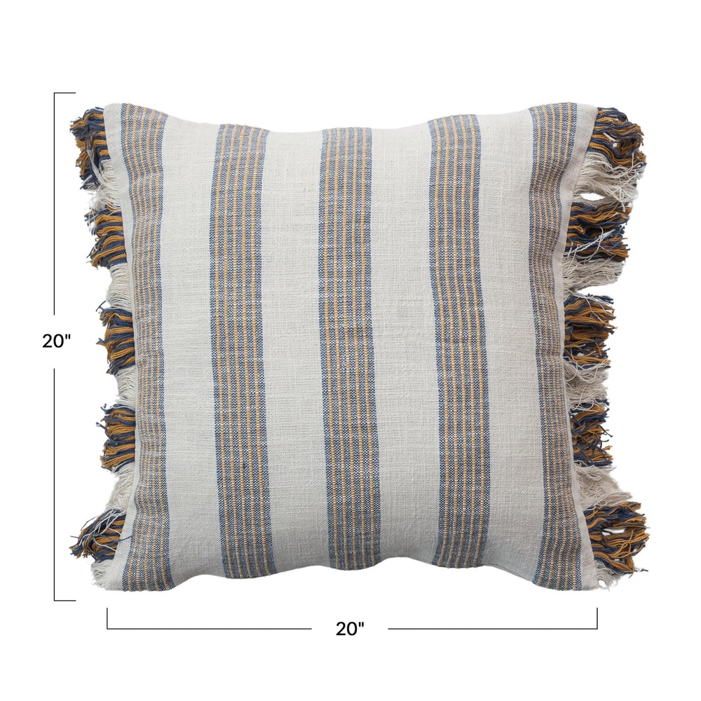 This Stripe Cotton Pillow with Fringe is a square-shaped delight, measuring 20 inches on each side. Its grey woven cotton fabric is highlighted by charming stripes and finished with fringe, adding texture and interest to the piece. The pillow's polyester fill ensures it is as comfortable as it is attractive, making it an excellent addition to a cozy nook or as part of a layered arrangement on a bed or sofa. Designed to complement a range of styles from the simplicity of a farmhouse to the elegance of French country to the comfort of a cottage, this pillow is a versatile choice for anyone looking to enhance their home with a touch of understated beauty. A cozy grey woven cotton pillow, adorned with elegant stripes and playful fringe, offering a touch of rustic charm An ideal accent for farmhouse, French country, or cottage-style decor, it brings a sense of warmth and homeliness Polyester fill insert included A durable cotton exterior holds the soft polyester fill, ensuring a snug and inviting feel 20” L x 20” W