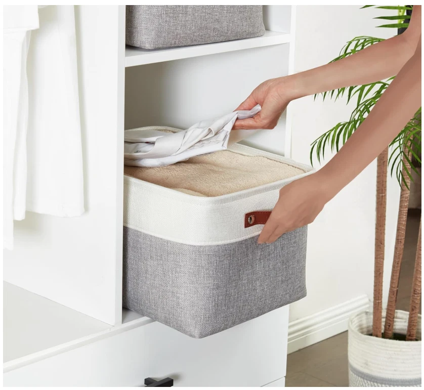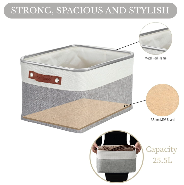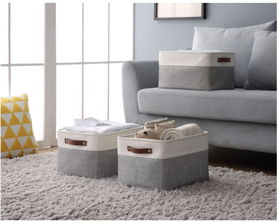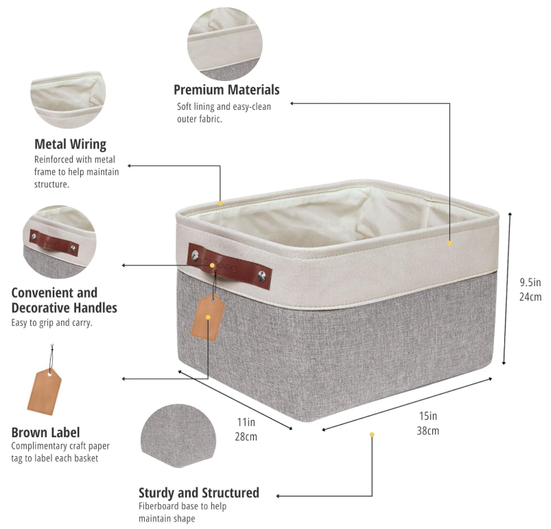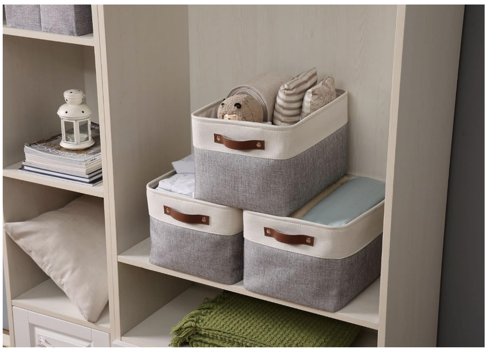 Storage Bins Fabric Storage Baskets for Shelves, Linen Closet Organization Toys Nursery (Grey and White, Large - 3 Pack) Cotton Fabric, Eva, Polyester, Faux Leather Sturdy Construction: Closet storage bins are reinforced with upper metal frame and 2.5mm MDF fiberboard bottom to keep the baskets upright. Comes with dual faux leather handles with the weight bearing capacity of 25 lbs. Label & Decorate: Fabric storage bins come with complementary craft paper tag and jute string to label each basket and identify the items inside easily. Trusted Brand: Since 2017, we has been dedicated to superior storage solutions. We prioritize 100% customer satisfaction, backed by a money-back guarantee. Need assistance? Contact us on Amazon for a response within 24 hours. Multi-Purpose: Use these as foldable storage baskets for shelves, closet storage bins, linen closet organizer, nursery basket storage, kid’s toys, pet products, laundry, towel, blanket, bedsheet, etc. Large Storage Bin: Set of 3 for better value and shopping convenience. Dimensions (each): 15” (L) x 11” (W) x 9.5” (H) / (38cm x 28 cm x 24 cm). Decorative storage boxes can be used in bedroom, living room, kitchen, office, closets, and cabinets. Care Tip: Our foldable baskets can be steam ironed or stuffed with blankets to get rid of wrinkles. These are easy to clean, just dust with a dry cloth, or spot clean with light soapy water when necessary. SHIPPING: We offer FREE shipping on all orders! We ship within Three business days of payment, usually sooner. We use a selection of shipping services such as UPS, FedEx, USPS etc. We only ship to the lower 48 states, no APO/FPO addresses or PO Boxes allowed. Local pickups and combined shipping options are not provided at this time. PAYMENT: We accept payment by any of the following methods: PayPal Please pay as soon as possible after winning an auction, as that will allow us to post your item to you sooner! FEEDBACK: Customer satisfaction is very important to us. If you have any problem with your order, please contact us and we will do our best to make you satisfied. Thank you for shopping with us!