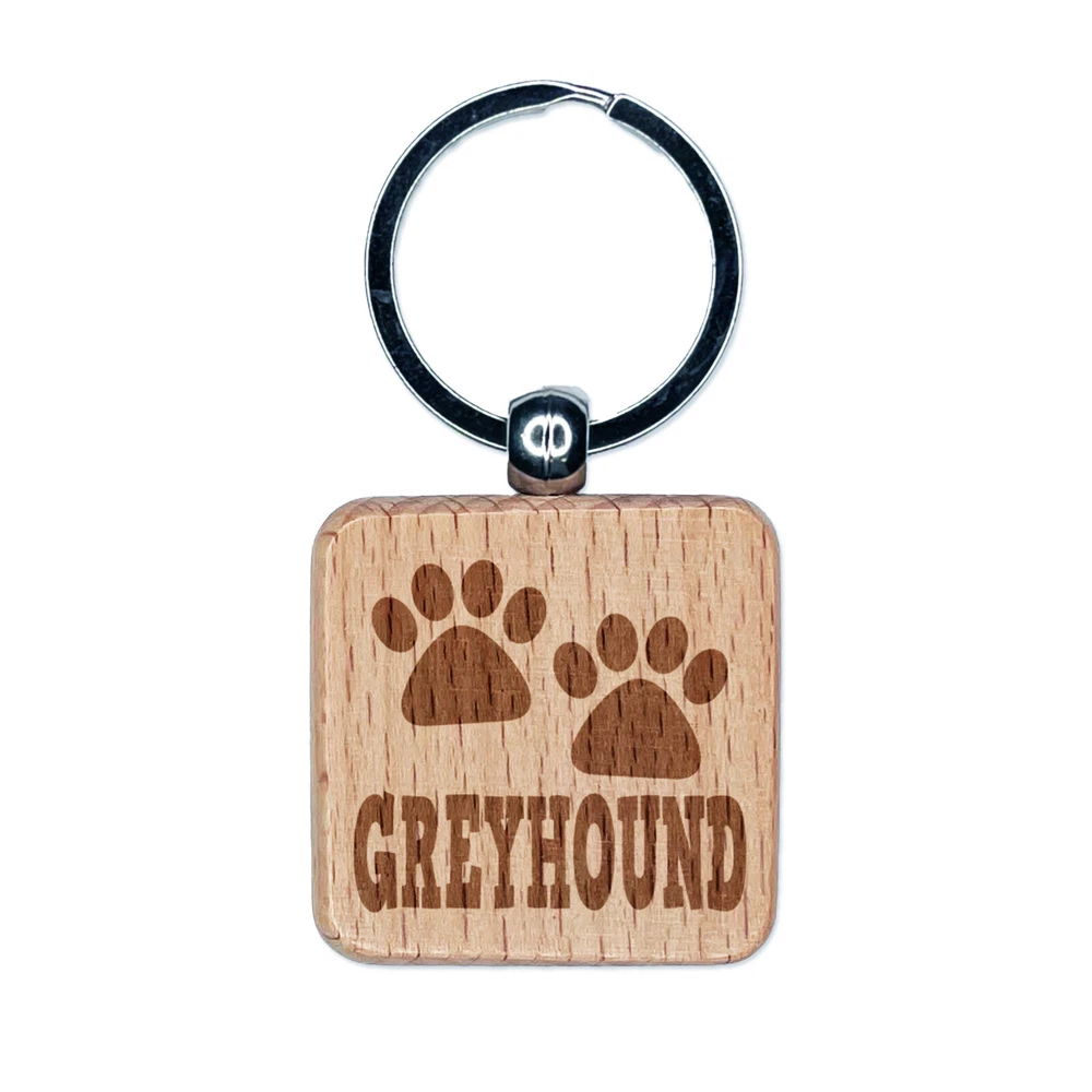 Greyhound Dog Paw Prints Fun Text Engraved Wood Square Keychain Tag Charm