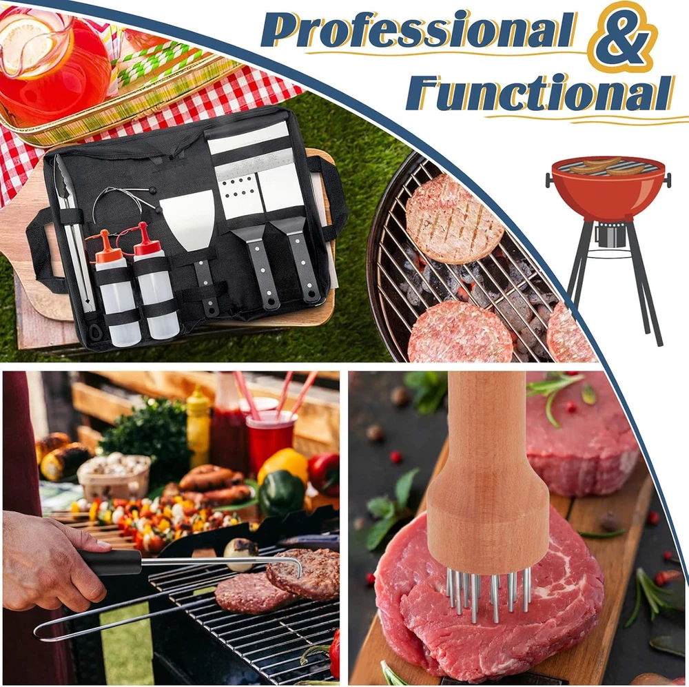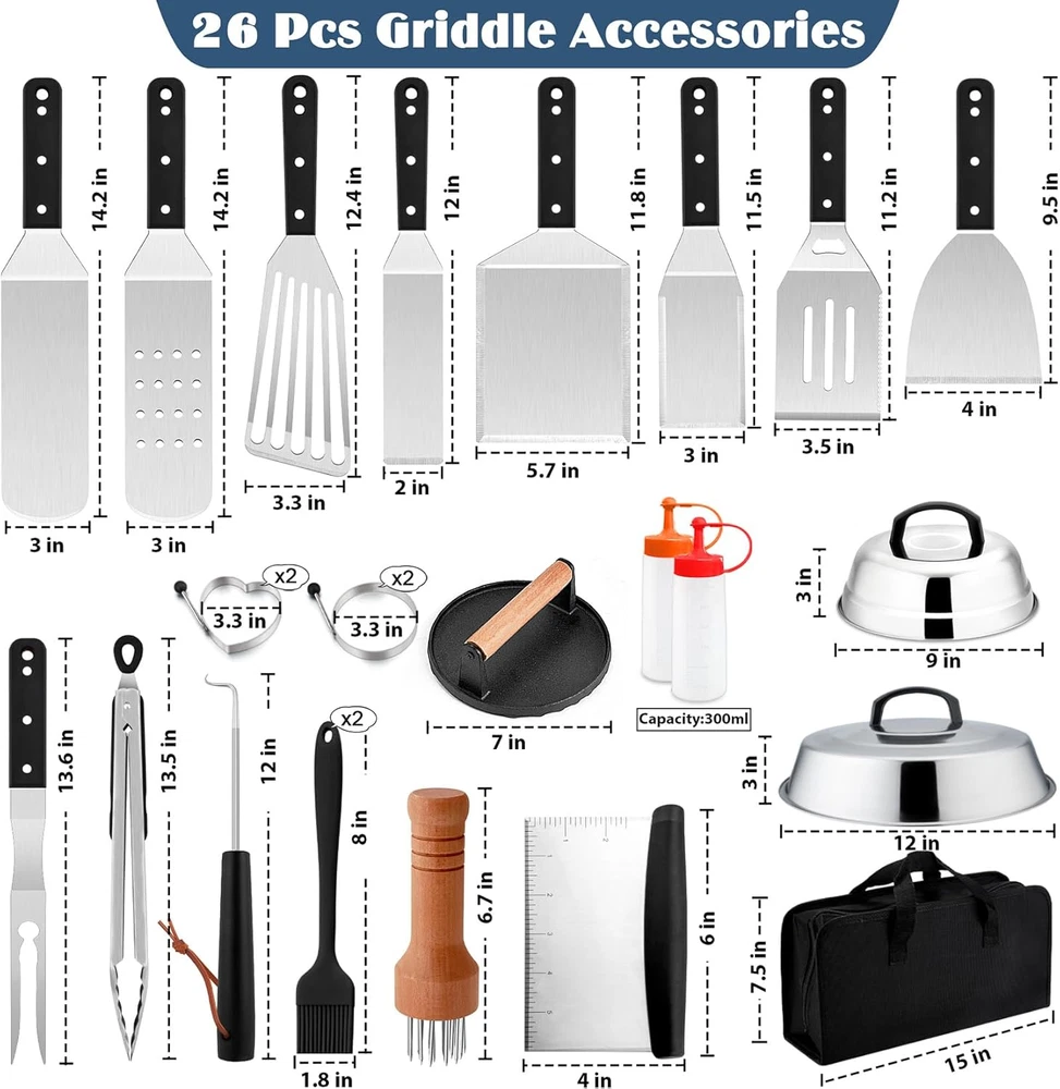 Griddle Accessories Kit Stainless Steel Flattop Grill Tools Set for Outdoor Camp 【VALUE GRIDDLE SET】 Package Included: 2 x Melting Dome ( 12”, 9” ), Long Griddle Spatula, Perforated Spatula, Multipurpose spatula, Burger Turner, Fish Turner, Griddle Spatula, Slant Edge Scraper, Bench Scraper, Narrow Turner, Cast Iron Griddle Press, Pigtail Food Flipper ( Right Handed ), Kitchen Tong, Grill Fork, Meat Tenderizer, 2 x Basting Brushes, 2 x Squeeze Bottles, 4 x Egg Rings, Storage Bag, Screwdriver 【PREMIUM & HEAVY DUTY】Our Grill Tools Set is made of high quality stainless steel, Which is food grade and heavy gauge, No worry any toxic materials into food, Dishwasher safe for less hassle, 1.5mm thick metal ensures holding heavy food without bending, Excellent heat resistant plastic handle, Effectively block the transfer of heat to keep your hands safe, 3-rivet construction increase the strength, Will not easy to fall off, Sturdy enough for long lasting use 【NECESSARY GRILL SPATULAS】 With 9 versatile spatulas, You will become the grill master on every BBQ party, Thin beveled edge sliding great under the food, 45° angled structure ensure a comfortable grip and help to flip food easily, Slotted design allows grease to drain for healthy diet, Holes on the handle are big enough to hang, Multi-Purpose Spatula has a serrated edge for cutting meat and also works as a bottle opener, Griddle Scraper with clear scale for precise measuring while using 【MELTING DOME & GRILL PRESS】 2Pcs Melting Dome help to avoid smells to be mixed together and reduce splatter, Retaining food moisture well to keep food juicy, Large cover is easy to deal with multiple steaks or large amount of vegetables, Small Lid is ideal for grilling patties or keeping food warm, Cast Iron Burger Press helps to retain and distribute heat perfectly, Pressing out excess fat or liquid from meats, Grooves texture will leave attractive grill marks on food 【THE EXTRA GRILLS TOOLS】 The Meat Flipper can pick up the foods without twisting, Won’t leave marks on the meats, Meat tenderizer has ultra-sharp needles, Help you quickly pierce the meat, Marinating it with condiments to taste more delicious, Grill Tong is strong enough to grip a large chunk of meat, Sharp Grill fork can grab meat while slicing meat, With a practical Carrying Bag, Convenient to take it anywhere Product Description Joyfair Griddle Accessories Kit is made of heavy duty stainless steel, allows these griddle tools maintaining a long service life. Suitable for most food, spatulas for flipping meat, sausages, cutting dough, basting cover for melting cheese, steaming vegetable, etc. 1 Melting Domes 2 More Details 3 Multipurpose 4 Easy to Use 1 Griddle Press 2 Pigtail Food Flipper 3 Meat Tenderizer 4 More Useful Tools Design for Outdoor & Indoor Item model number Griddle Accessories Set of 26 Item dimensions L x W x H 12 x 12 x 6 inches Material Type ABS Handles Product Dimensions 12 x 12 x 6 inches Material ABS Handles Country of Origin China Is Dishwasher Safe Yes Item Weight 4.71 Kilograms Handle Material Acrylonitrile Butadiene Styrene (ABS) Number of Pieces 26 Included Components Spatula Shipping Fast shipping is very important for us. Our expedited US shipping service is FREE. Your order will be shipped within 2 business days upon full payment received. Your order will be delivered within 2-3 business days after the handling time. Warranty & Returns 30-Day FREE Return Policy offered for unsatisfactory items. Options include: Refund or Exchange for another item. Contact us Customer satisfaction is our top priority. If you encounter any issues with our product, please don't hesitate to reach out to us. We are committed to ensuring your satisfaction and will go above and beyond to assist you. Your happiness is our goal! Thank you for shopping at our store.