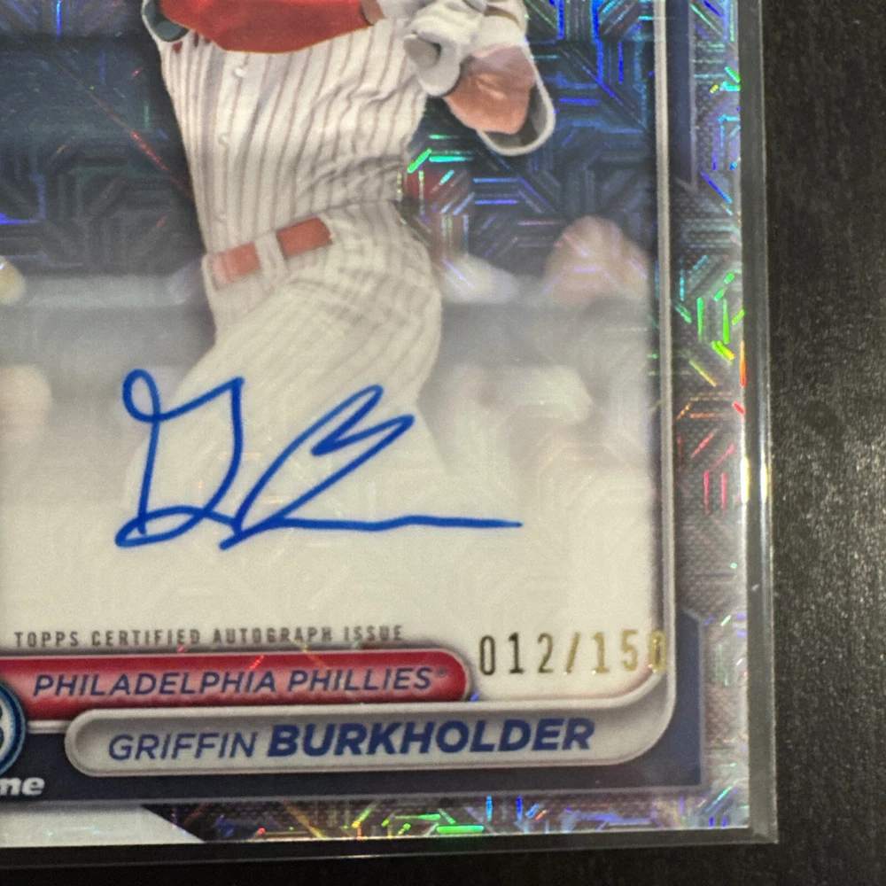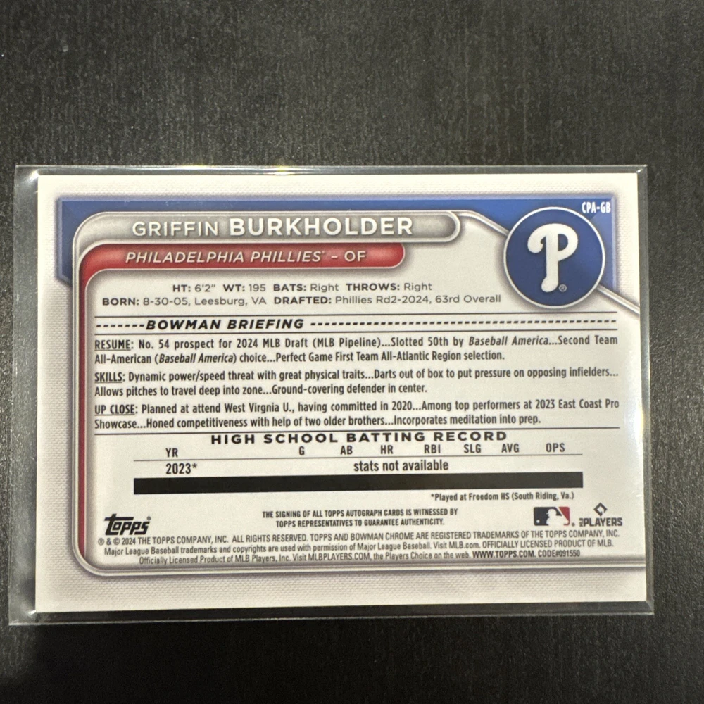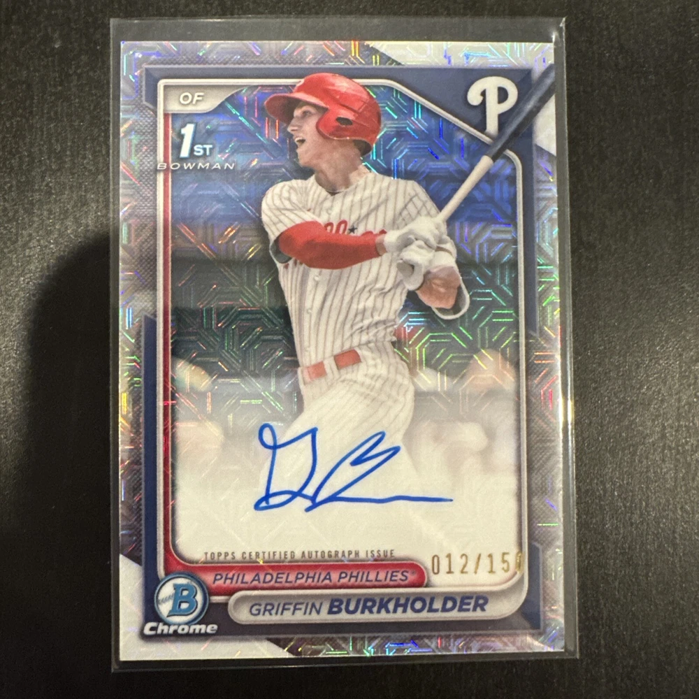 This is a Griffin Burkholder 2024 Bowman Draft baseball trading card, featuring an autograph from the player. It is part of the HTA Choice Refractor Auto parallel set, with a card number of CPA-GB and limited to only 150 copies. The card is in near mint or better condition and showcases Burkholder as a prospect for the Philadelphia Phillies in the 2024 season. This collectible item would be a valuable addition to any baseball trading card collection.