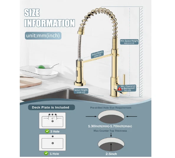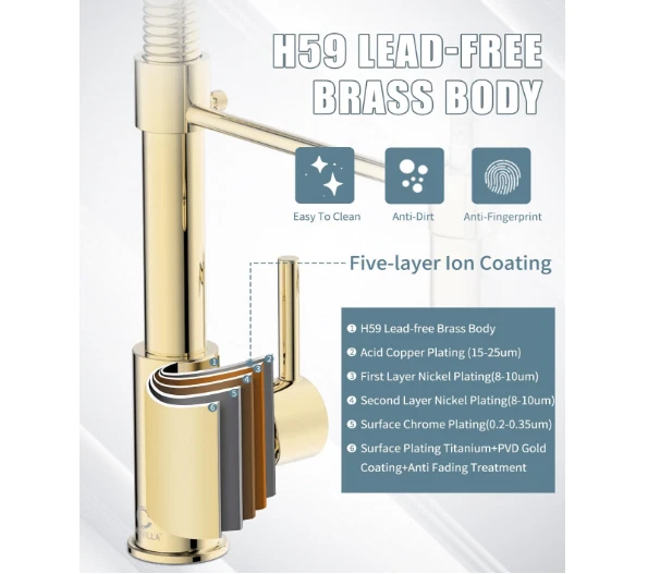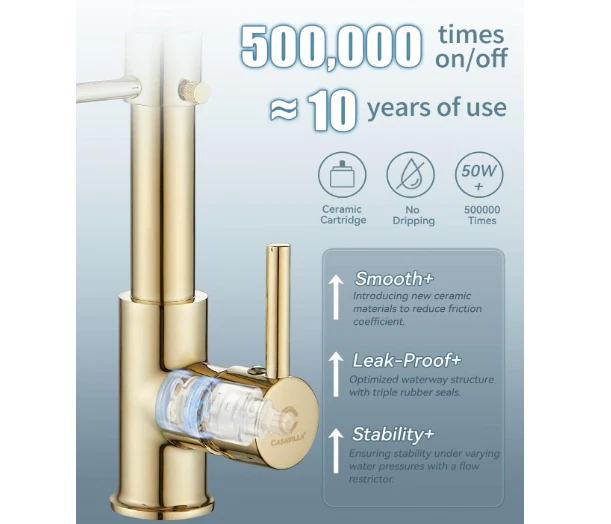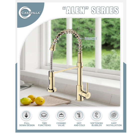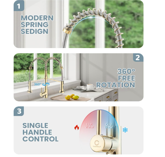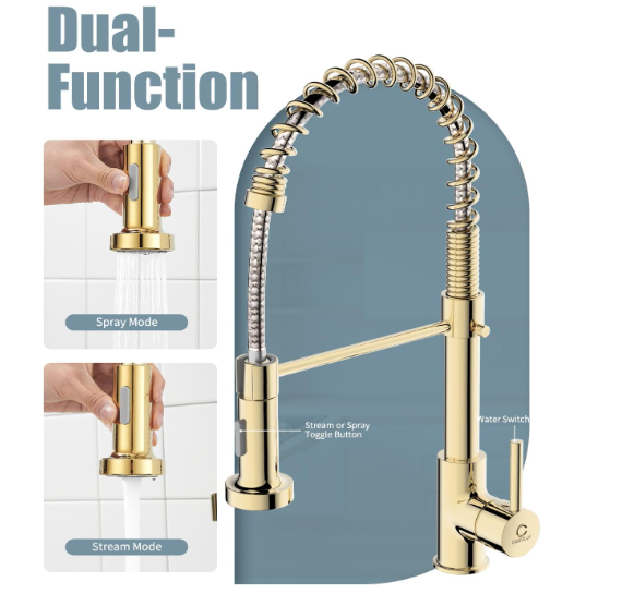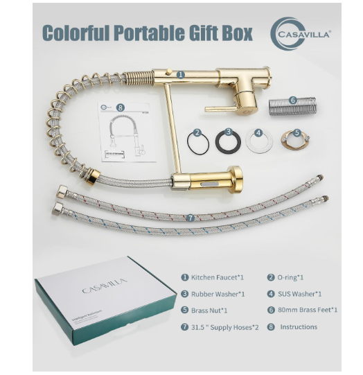 Grifo cocina comercial dorado acero inoxidable con rociador extraíble 【DINERO BIEN INVERTIDO】 Altura total: 17"; Altura del caño: 4,92" (proporciona más espacio para maniobrar sin necesidad de cambiar la boquilla); Alcance del caño: 20,5 cm. Diseño universal para una estética completa, que mantiene la uniformidad en el uso y le brinda una experiencia familiar. Estamos seguros de que si prueba este grifo, lo recomendará a sus amigos y familiares. 【FÁCIL DE USAR】 Manija única inteligente para un control sencillo de la temperatura y el caudal del agua. Cabezal de ducha extraíble de plástico de alta presión con dos modos de rociado (chorro y rociado). El caño giratorio de 360° con arco alto es amplio y cómodo para alcanzar todo el fregadero, ofreciendo un amplio rango de lavado. La manguera PEX de alta temperatura garantiza un flujo de agua más seguro e higiénico y ayuda a prevenir fugas y roturas. 【FÁCIL MANTENIMIENTO】 Cuerpo de latón macizo sin plomo y resorte de acero inoxidable SUS 304 de grado comercial, forjados. El tratamiento superficial PVD Gold, con contenido de cromo/níquel 18/8, proporciona un acabado superior anticorrosivo y antioxidante que evita que la suciedad, como huellas dactilares o manchas de agua, se adhiera al grifo. Su superficie facilita la limpieza de la cocina. Basta con limpiarla a diario con un paño o agua; menos tiempo limpiando y más tiempo disfrutando con la familia. 【FÁCIL DE INSTALAR】 El grifo de fregadero de cocina estilo rústico para montaje en encimera incluye todos los accesorios de montaje (todas las piezas están separadas y protegidas con espuma EPE para evitar daños durante el envío). Instale el grifo en 4 sencillos pasos; hágalo usted mismo sin necesidad de un fontanero. Ahorre tiempo y dinero.