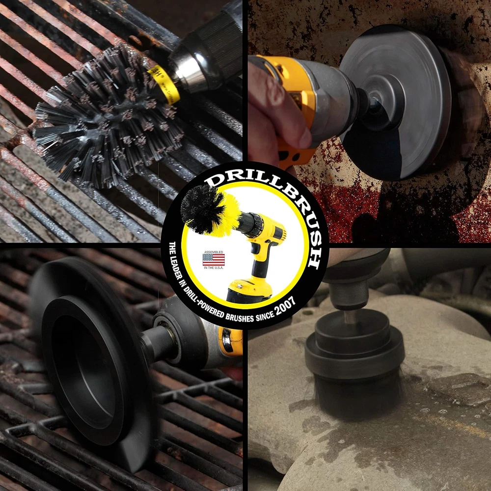 Grill Brush BBQ Cleaning Tool Set Scraper Stiff Bristles for Gas Electric Smoker Product Description Complete drill powered brush kit to clean BBQ grills and grates. Modernize your grilling game with these all nylon grill brushes from Drill Brush Power Scrubber by Useful Products. Steel wire fragments and food are not a good match. Why clean your grill, smoker, or grate with old fashioned wire brushes? Fragments of wire have been known to break off, contaminating the food and posing a serious health risk. These brushes are nylon, so always use their fearsome cleaning power on a COOL grill (brush will melt to a hot grill). Out camping and need a power cleaning solution for your cast iron skillet? The Black Original Drillbrush will return your cat iron cookware to like-new condition. The newly designed Ultra-stiff black nylon wheel brush has all the advantages of a tradition wire wheel brush without shedding loose or broken wires. Modernize your outdated rusty wire brushes that never get clean and tend to fray as well. Replace all your drill powered wire brushes with these aggressive, Ultra-stiff Black, all nylon, drill powered upgrades. No more broken and loose flying wires to deal with. All Drill Brush Attachments in this kit feature rugged steel, quarter-inch, quick-change shafts. Fits drills AND drivers. See our complete line of Drillbrush power scrubbing brush products by clicking on our brand. Cordless drill NOT included. Clean Faster Combine the spinning motion of your power drill with any of our brushes and start cleaning with speed and power used by professional cleaners everywhere. Clean Easier Drillbrush strives to make cleaning easier and more fun than ever before. We want to make cleaning less of a chore and give you more time to spend doing the things you love. Clean Better Drillbrush works hard to make sure you always have the right tool for the job. We are constantly listening to feedback and creating new products where we think we can help consumers start cleaning easier. Clean Anything Join the millions of happy Drillbrush customers and get that car, bathroom, kitchen, boat, garage, or grill looking brand new. Whatever the application may be Drillbrush has a cleaning kit for you. Unit Count 1 Count Number of Items 4 Color Black Product Dimensions 5 x 5 x 5 inches Material Nylon Handle Material Metal Item Firmness Description Stiff Item Weight 14 ounces Batteries required No Shape Round Specific Uses For Product function(f) {var _np=(window.P._namespace("DetailPageProductOverviewTemplatesJava"));if(_np.guardFatal){_np.guardFatal(f)(_np);}else{f(_np);}}(function(P) { P.when('A').execute(function(A){ A.on('a:truncate:po-attribute-truncate-3:updated', function(data) { var isTruncated = !data.truncateInstance.getIfTextFits(); var seeMoreElement = document.getElementById('po-attribute-see-more-id-3'); if(seeMoreElement) { seeMoreElement.style.display = isTruncated ? '' : 'none'; } }) }); })); Grill, Smoker, Oven, Charcoal Grates, Brick and Mortar, Stone Walls, Metal Surfaces, Concrete, Vehicle, Golf Club, Furniture, Patio, Deck See more Surface Recommendation Metal, Stone Global Trade Identification Number 00810003602558 Included Components Attachment Special Feature Bristle-Free Shipping Fast shipping is very important for us. Our expedited US shipping service is FREE. Your order will be shipped within 2 business days upon full payment received. Your order will be delivered within 2-3 business days after the handling time. Warranty & Returns 30-Day FREE Return Policy offered for unsatisfactory items. Options include: Refund or Exchange for another item. Contact us Customer satisfaction is our top priority. If you encounter any issues with our product, please don't hesitate to reach out to us. We are committed to ensuring your satisfaction and will go above and beyond to assist you. Your happiness is our goal! Thank you for shopping at our store.