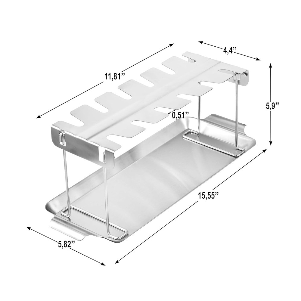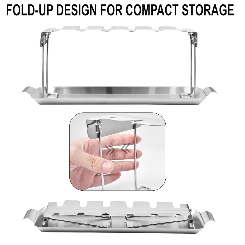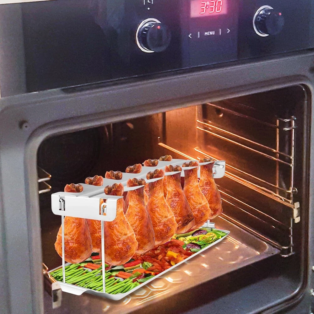 DURABLE AND LONG-LASTING This chicken leg rack for grill is crafted from premium quality stainless steel and thick metal to withstand high temperatures. Fade-resistant and non-corrosive, this chicken drumstick holder ensures long-term use for all your grilling, smoking, and oven needs. Plus, it’s food-safe, making it a reliable choice for your cooking. INCLUDES DRIP TRAY Designed with a drip tray that fits neatly under the chicken leg rack, it catches drips to prevent flare-ups on the grill and minimize mess. This chicken rack also allows you to use the flavorful drippings to enhance sauces or gravies for a delicious finish. Chicken Drumstick Holder for Grill Simply hang your drumsticks or wings in all 12 slots of this chicken lollipop rack and let them cook evenly without flipping! Not only does this chicken rack for grilling reduce cooking effort, but it also achieves perfect tenderness and juiciness on all sides, making your meal flavorful every time. Chicken Leg Rack for Grill with Drip Tray - 12 Slots Drumstick Rack