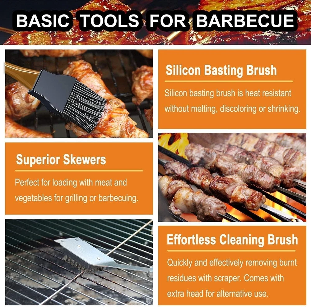 Grilljoy 31PC Heavy Duty BBQ Grilling Accessories Grill Tool Set - Stainless Steel Grilling Kit with Storage Bag for Camping, Tailgating - Perfect Barbecue Utensil Gift for Men Women--Paper package box might vary from image shown · Unlike many other grill utensil set that are flimsy, rust, or break after a few uses, our 31-piece premium BBQ set boasting the variety of grill accessories is crafted with high-quality stainless steel for ensuring its feature of durable and long lasting, so you won?t constantly replacing your grill accessories and always have the right BBQ tool at hand. · Suited to any grills, GRILLJOY barbecue kit set is the best grill utensil set you could ask for. With spatula, tongs, fork, basting brush, cleaning brush, extra brush head, glove, thermometer, grill mats, skewers, corn holders, salt & pepper shakers, scissors & straws set, you have everything you need to grill masterful meals and all the grill gadgets will last for years. · Bring out your inner grill master with this complete BBQ tool kit. From slotted spatula to grill gadgets, it?s necessary to have the versatile grill tools to keep your grill running smoothly. All long-handled BBQ accessories make it safer to grill over high heat, while a 4-1 massive spatula helps prevent scalding food drippings from splashing on unsuspecting grills, and the fork with curved tines let you grab large meat with ease. · Additionally, dependable grill cleaning tools for extending your grill life and keep it looking like new; Kitchen scissors crafted to assist with daily food preparation; Updated thermometer is the ultimate grilling tool for achieving grilling perfection. You are a better chef than you imagine but needed the right grill tools to prove it! Now you have them. · Also, the superb quality grilling accessories all fit perfectly in the storage carrying bag, which is a great grill gift for any grilling enthusiast on Birthday, father?s day& any holidays! Whether you are grilling in your backyard, tailgating at the game or grilling up at the campsite, this compact carrying bag makes it easy to carry these BBQ tools anywhere you light up your grill.