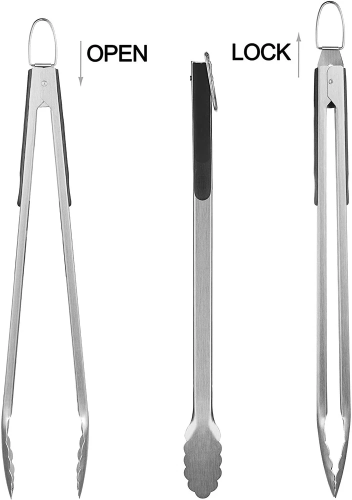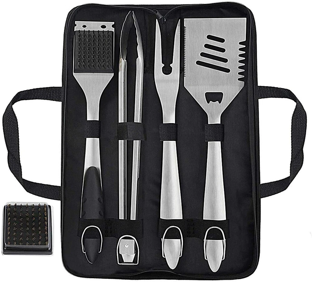 Grilljoy 6PCS Heavy Duty BBQ Grill Tools Set with Extra Thick Stainless Steel Spatula, Fork, Tongs & Cleaning Brush - Complete Barbecue Accessories Kit with Portable Bag - Perfect Grill Gifts for Men · 【 Complete Barbecue Accessories 】 BBQ spatula, fork, tongs, grill cleaning brush, extra brush head and storage bag. These tools were made of extra thick stainless steel, easy to clean, dishwasher safe. · 【 Premium Quality 】 Our BBQ tools were made of high-quality stainless steel. As a set of heavy-duty barbecue tools, it is extremely thick and difficult to bend by hand. You don't need to worry about tools being rusted or cracked · 【 Elegant Design 】 As soon you remove these deluxe tools from the portable bag, you'll immediately notice the perfect heft and comfortable rubber grips. Ergonomic grips and exquisite balance will make them feel like an extension of your arm. · 【 Convenient Storage 】 Compared to the single-use packaging box, the carrying bag is more practical. You can easily protect your grilling tools in the portable storage bag and take them with you for travel or camping. It is a perfect present for Father’s Day, Mother’s Day, birthdays, Christmas, wedding and housewarming.
