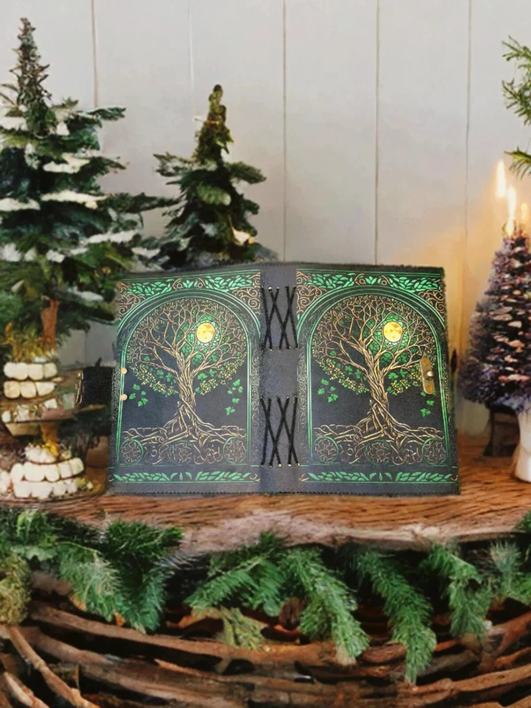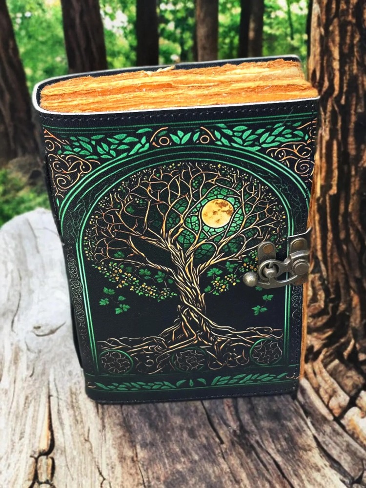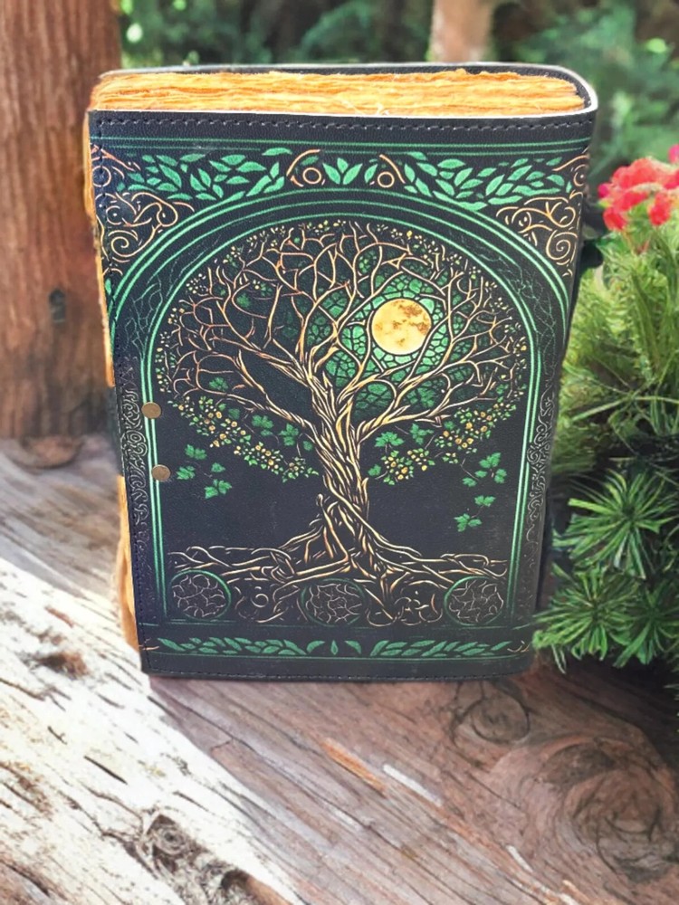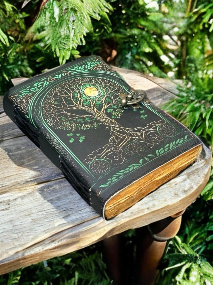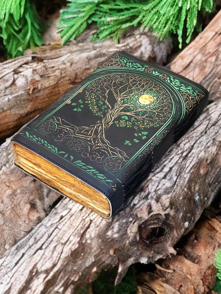 The Grimoire Leather Journal is a luxury, limited edition blank spell book featuring a print Tree of Life design on the cover. Handmade in India, this personalized journal is perfect for those seeking a unique and mystical writing experience. The leather cover adds a touch of elegance, making it a special and distinctive piece for anyone in need of a special journal for their magical or spiritual practices. Grimoire leather journal, Print Tree of Life Journal, Blank spell book book of shadows Leather Celestial Gifts For Him Her • Print - Tree of life • Vintage lock closure • Genuine buffalo leather • Vintage deckle edge old paper • handmade rustic cotton paper • 100 Sheet (200 pages both side) ●Leather journal witchcraft book of shadows notebook is made with 200 pages of Antique Paper which looks like it was pulled from history. You will fall in love with the the antique handmade cotton paper which is unique to our Vintage Journal Notebook. ● The vintage clasp lock will keep all your valuable writing locked inside.Sturdy hand stitched binding to make sure that no paper comes out loose from your spell notebook. ● The witchcraft supplies journal is printed with a special seven stone called “Chakra healing” which helps to reveal inner truth within yourself and encourage self-awareness and self expression. We have taken extra to make sure that the emboss is perfect in every piece. ● Sketch, Doodle, Write on your Leather Blank Spell Journal with a Calligraphy Pen Fountain Pen, Brush Pen, Ball Pen, Acrylic Colours, Watercolor and many more. We guarantee no bleed through. ● Can be used as a notepad, journal, writing notebook, sketch book. 1.25 inch thickness, easy for handwriting, drawing or sketching and compact for carrying in your bag. Ideal for alternative ● Artist Sketchbooks, Photo Album, Traveling Notes, Business Executive, Logbook, Poetry Work, Journalists, Food Planner, Instagram Scrapbook and Bible Journaling. ● Best Gift For Your Companion: A Journal Is Like A Trusted Friend. You Can Use It To Solve Queries, Get Inventive, Or Record Valuable Memories For Them To Last Forever Or You Can Just Use It As A Gift For Your Wife, Son, Or A Daughter Or For Some Enthusiastic Writer In Your Family. Even For Looking For A Miraculous Spell Book Or A D&D Gamer Looking For His Quest Book. ● Perfectly Sized For Multi-Purpose Use: Length 5", Width 1", Height 7" Inches, This Easy To Carry Personal Diary Is Perfect To Use As A Health Journal, Sketchbook, And Poetry Journal. It’S An Ideal Journal Which Records Your Daily Thoughts And Life Lists. And Also Good For Designing, Doodling, Or Calligraphy Of Your Choice Ignore Leather journal Christmas gifts Tree of life Book of shadows Wicca spell book Spell book Sun and moon Journal for gifts Tree of life journal Grimoire Grimoire Journal Tree moon phase Blank spell book Magic diary Star spell book Grimoire books Grimoire Witch Pagan spell book Snake spell book Spell book 11*13 Mid evil book