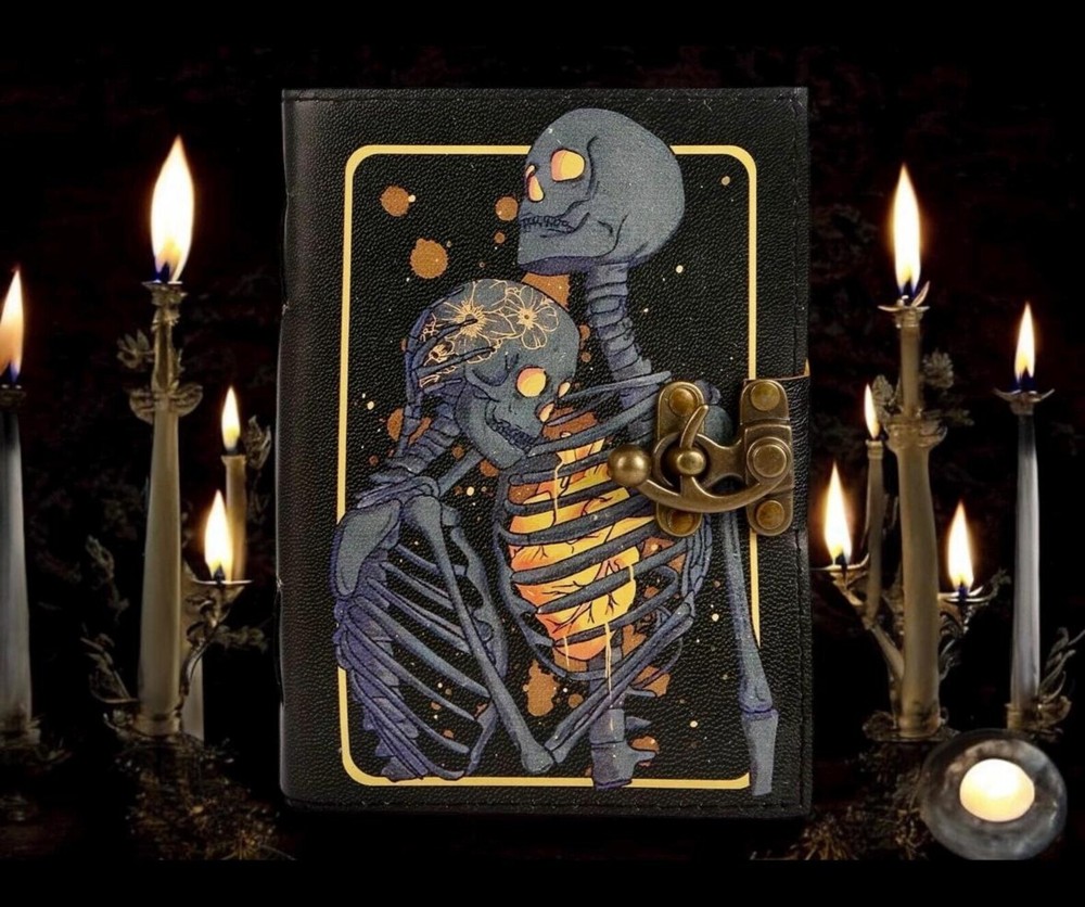 The Grimoire Printed Journal is a luxurious and limited edition notebook featuring a beautiful leather cover with a Gothic design and skull motif. This handmade journal is personalized and perfect for those seeking a unique and mystical writing experience. Made in India, this special edition notebook is a must-have for anyone looking to add a touch of occult charm to their writing. Book of Spells Grimoire Printed Journal The Lovers Tarot Notebook Spiral Gothic Notebook Skull lover Antique Journals gifts for men or women • Vintage lock closure • Genuine buffalo leather • Vintage deckle edge old paper • handmade rustic cotton paper • 100 Sheet (200 pages both side) - Leather journal witchcraft book of shadows notebook is made with 200 pages of Antique Paper which looks like it was pulled from history. You will fall in love with the the antique handmade cotton paper which is unique to our Vintage Journal Notebook. ● The vintage clasp lock will keep all your valuable writing locked inside.Sturdy hand stitched binding to make sure that no paper comes out loose from your spell notebook. ● The witchcraft supplies journal is printed with a special seven stone called “Chakra healing” which helps to reveal inner truth within yourself and encourage self-awareness and self expression. We have taken extra to make sure that the emboss is perfect in every piece. ● Sketch, Doodle, Write on your Leather Blank Spell Journal with a Calligraphy Pen Fountain Pen, Brush Pen, Ball Pen, Acrylic Colours, Watercolor and many more. We guarantee no bleed through. ● Can be used as a notepad, journal, writing notebook, sketch book. 1.25 inch thickness, easy for handwriting, drawing or sketching and compact for carrying in your bag. Ideal for alternative ● Artist Sketchbooks, Photo Album, Traveling Notes, Business Executive, Logbook, Poetry Work, Journalists, Food Planner, Instagram Scrapbook and Bible Journaling. ● Best Gift For Your Companion: A Journal Is Like A Trusted Friend. You Can Use It To Solve Queries, Get Inventive, Or Record Valuable Memories For Them To Last Forever Or You Can Just Use It As A Gift For Your Wife, Son, Or A Daughter Or For Some Enthusiastic Writer In Your Family. Even For Looking For A Miraculous Spell Book Or A D&D Gamer Looking For His Quest Book. ● Perfectly Sized For Multi-Purpose Use: Length 5", Width 1", Height 7" Inches, This Easy To Carry Personal Diary Is Perfect To Use As A Health Journal, Sketchbook, And Poetry Journal. It’S An Ideal Journal Which Records Your Daily Thoughts And Life Lists. And Also Good For Designing, Doodling, Or Calligraphy Of Your Choice.