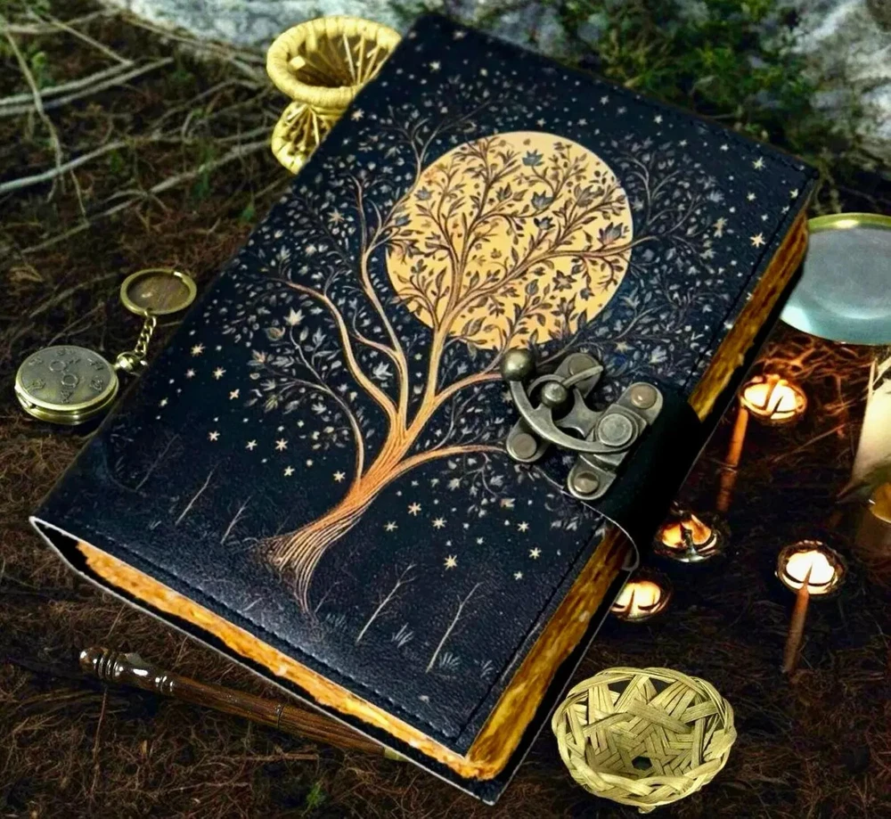 The Grimoire leather journal is a luxurious and limited edition blank spell book, perfect for those who enjoy writing their thoughts and ideas. This handmade journal features a beautiful leather cover with a Tree of Life print, adding a touch of mysticism to the pages inside. Personalized to the user's preference, this journal is ideal for business and industrial use, providing a unique and stylish option for note-taking and planning. Originating from India, this journal offers a blend of quality craftsmanship and spiritual design. Grimoire leather journal, Print Tree of Life Journal, Blank spell book book of shadows Leather Celestial Gifts For Him Her • Print - Tree of life • Vintage lock closure • Genuine buffalo leather • Vintage deckle edge old paper • handmade rustic cotton paper • 100 Sheet (200 pages both side) ●Leather journal witchcraft book of shadows notebook is made with 200 pages of Antique Paper which looks like it was pulled from history. You will fall in love with the the antique handmade cotton paper which is unique to our Vintage Journal Notebook. ● The vintage clasp lock will keep all your valuable writing locked inside.Sturdy hand stitched binding to make sure that no paper comes out loose from your spell notebook. ● The witchcraft supplies journal is printed with a special seven stone called “Chakra healing” which helps to reveal inner truth within yourself and encourage self-awareness and self expression. We have taken extra to make sure that the emboss is perfect in every piece. ● Sketch, Doodle, Write on your Leather Blank Spell Journal with a Calligraphy Pen Fountain Pen, Brush Pen, Ball Pen, Acrylic Colours, Watercolor and many more. We guarantee no bleed through. ● Can be used as a notepad, journal, writing notebook, sketch book. 1.25 inch thickness, easy for handwriting, drawing or sketching and compact for carrying in your bag. Ideal for alternative ● Artist Sketchbooks, Photo Album, Traveling Notes, Business Executive, Logbook, Poetry Work, Journalists, Food Planner, Instagram Scrapbook and Bible Journaling. ● Best Gift For Your Companion: A Journal Is Like A Trusted Friend. You Can Use It To Solve Queries, Get Inventive, Or Record Valuable Memories For Them To Last Forever Or You Can Just Use It As A Gift For Your Wife, Son, Or A Daughter Or For Some Enthusiastic Writer In Your Family. Even For Looking For A Miraculous Spell Book Or A D&D Gamer Looking For His Quest Book. ● Perfectly Sized For Multi-Purpose Use: Length 5", Width 1", Height 7" Inches, This Easy To Carry Personal Diary Is Perfect To Use As A Health Journal, Sketchbook, And Poetry Journal. It’S An Ideal Journal Which Records Your Daily Thoughts And Life Lists. And Also Good For Designing, Doodling, Or Calligraphy Of Your Choice Leather journal Tree of life Tree leather journal Witch craft Witch Witch decor Rustic journal Grimoire journal Book of shadows Wicca pagen Christmas gifts Sun and moon Blank spell book Book of shadows Celestial gifts Gifts for him her