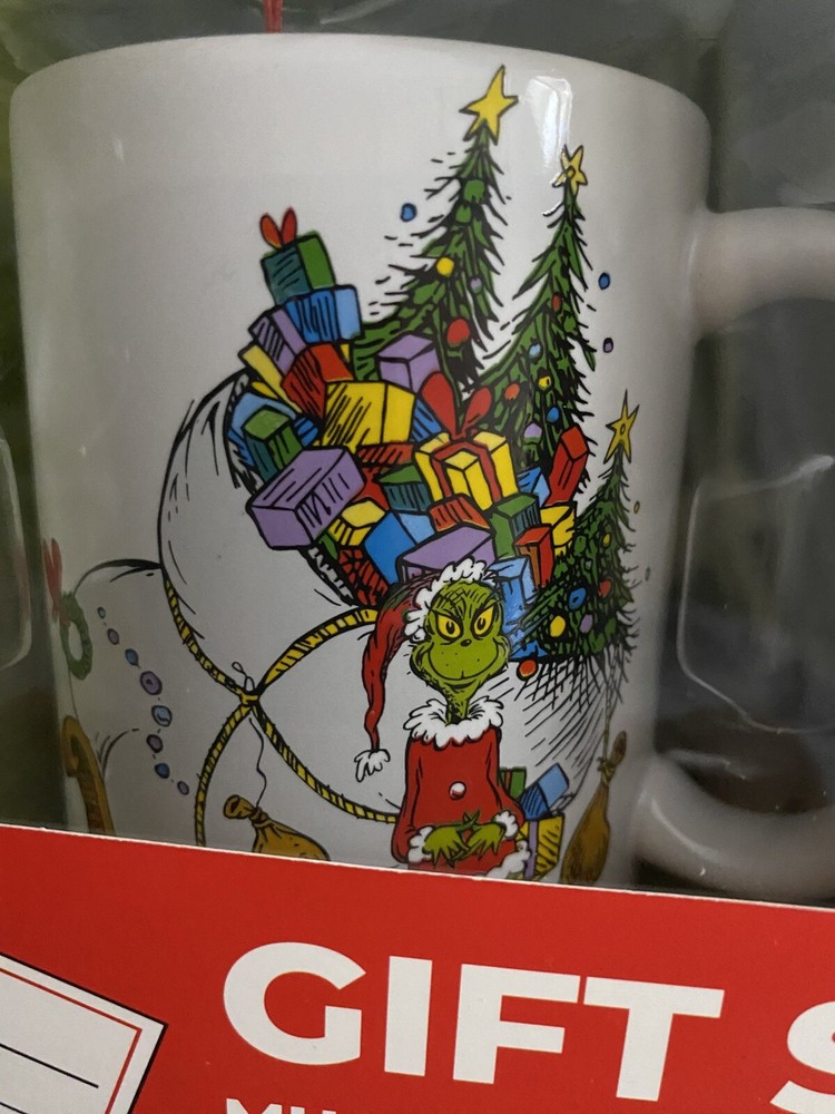 New The Grinch Dr Seuss Gift Set 12 Oz Ceramic Mug,Crew Socks,Acrylic Door Hanger The Grinch Dr. Seuss Gift Set includes a 12 oz ceramic mug, crew socks, and an acrylic door hanger. The set features an animated Grinch character in green, yellow, and red colors, perfect for a Christmas occasion. This licensed reproduction from Culturefly is part of the Dr. Seuss collection and is ideal for fans of The Grinch. New unused condition in original packaging, thanks for looking.